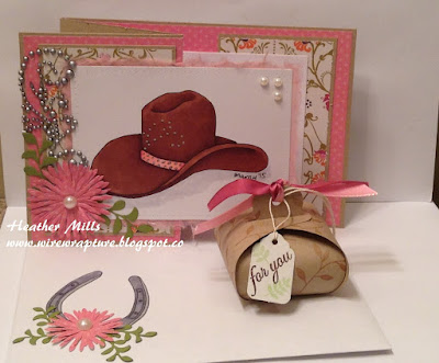 Due to the large size of the card, I used my envelope punch board to create an envelope for it. I totally forgot to to take a picture of the inside of the envelope. I used a sheet of patterned paper that looks like a hale bale which I thought was perfect to go along with the cowgirl theme. I decorated the envelope with the horseshoe image and added a flower to coordinate with the card.I created this adorable little treat holder to hold s special little gift I made for her. I used the same kraft card stock as the card and added some pink ribbon to tie it into the card color scheme. I stamped the box with a small leaf sprig stamp to add some interest and finished it off with a sweet little tag.