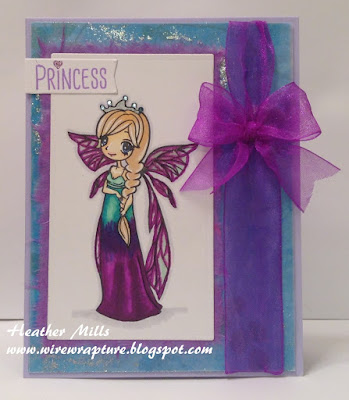 I matted the  image on some violet mulberry paper, and added some light blue rhinestones to her crown.  Then I finished it all off with some fabulous sheer ribbon recycled from a gift I received last year.