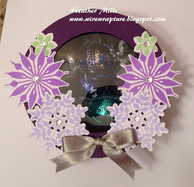 I used the standard size box, the larger lid (though now that I'm thinking about it, that is probably really to be used with the taller box, but it worked for me.) with the window option. I stamped a strip of white paper with the snowflakes and adhered the strip to the sides of the box before assembling everything.Since the lid comes down almost all the way to the bottom of the box, I didn't bother decorating the sides of the box, just the lid. I finished off the top edges of the lid with some ribbon I had sitting on my desk. I've had it forever, and finally managed to use it up!! (I also used the last bit to tie a bow for the top.) This box is surprisingly big. My sister and I went shopping at an Outlet Mall on Monday and of course, we had to get some chocolate truffles at Lindt. So, when I was looking for something to fill my box with, I thought of the truffles. I think this box would fit 10 of them just about perfectly. I had 7 (ate the other 3 already!) and there is plenty of room left.