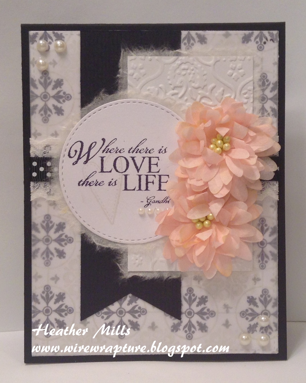 I won these gorgeous handmade flowers from Petal Lu a month or so ago and knew they would be perfect for a wedding card (no going through the mail for these beauties!!). Then I saw the Viva La Verve sketch for the month of May and knew it was the one I was going to use. The stitched circle was in my bits and pieces stash as well as the bit of lace behind the dotted ribbon. I created the "paper" with PTI's "Guide Lines 2". I love this set for creating patterned "paper". To soften the black ink, I added a panel of vellum directly over the top of the stamped layer; it adds such a soft touch. The torn mulberry paper helps with that, too. The little panel on the right was embossed with a damask embossing folder. Everything was finished off with some pearls and a small light gray heart stamped on the sentiment panel.Supplies:
