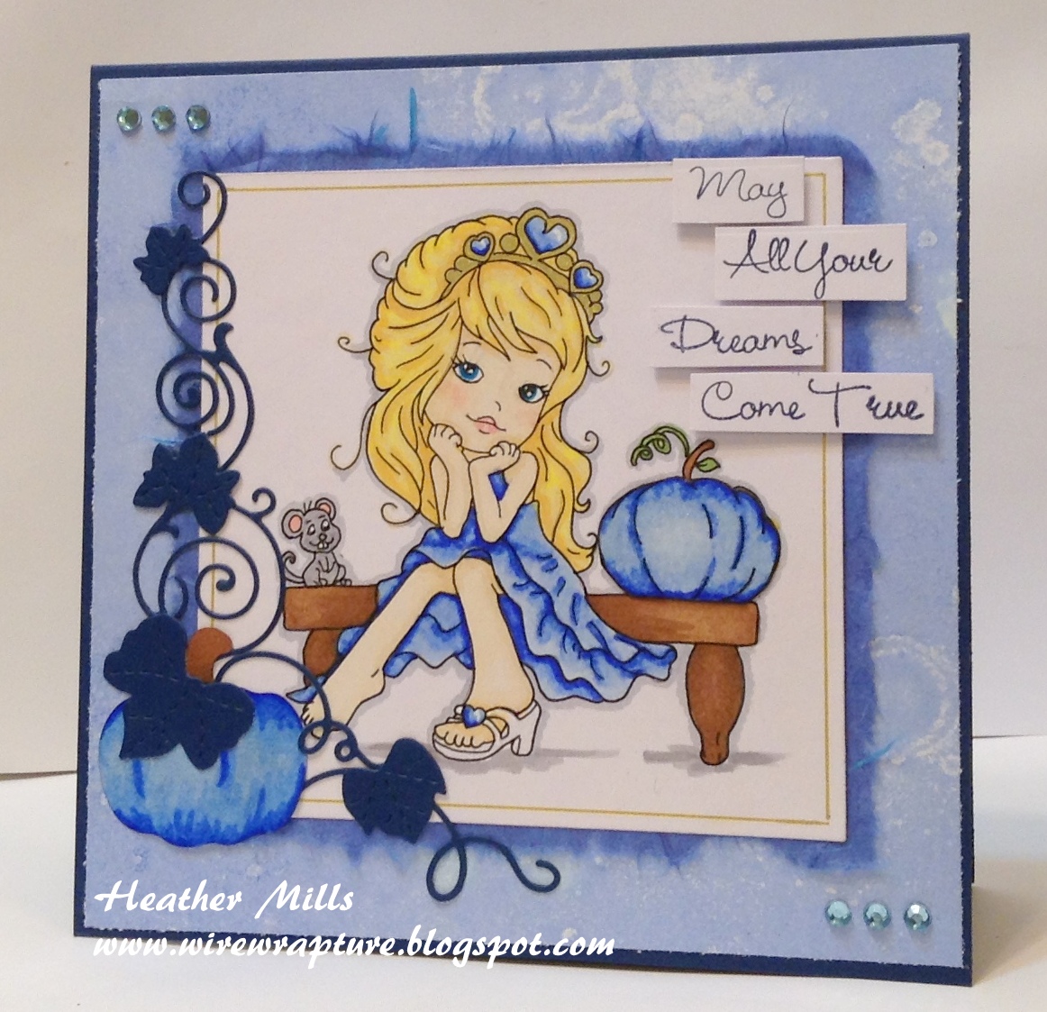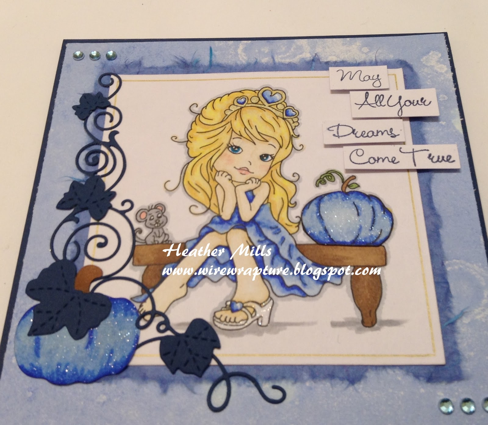 I think natural hair and skin colors are acceptable with monochromatic color schemes, so I used the optional twist as well. I did color the pumpkin orange originally, but it was just too much, so I colored another image and added it on top. I added some wink of stella for a nice sparkle, because if a magic pumpkin can be blue (it is magic after all), then it definitely would be sparkly! I also added the wink of stella on her glass slipper and the punched out pumpkin. You can see the sparkle in the photo below.I had a couple punched out pumpkins in my bits and pieces stash that I figured I would have to wait until Fall to use. But as the image has a pumpkin in it, I realized a pumpkin would be the perfect embellishment. So, I colored one up to match the one in the image and added some die cut leaves, vines and a flourish. I thought the image looked a little plain, so I used the same gold pen that I colored her crown with to add a frame around the square. Just enough! I finished everything off with a few rhinestones and a fun sentiment treatment.