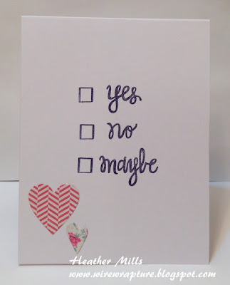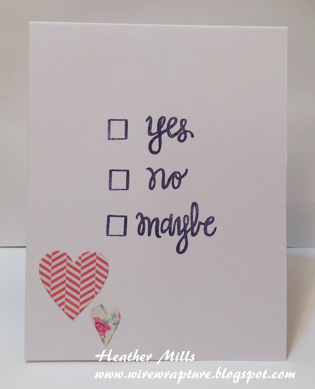 This is the final Valentine's Day card I made this year. I got this stamp set last year and really wanted to use it. So fun because it comes with the sentiment options that I used on the inside. It totally reminds me of being in middle school and all the "check 'yes' or 'no' note passing that used to go on). I used tons of patterned paper scraps by die cutting all these fabulous hearts.