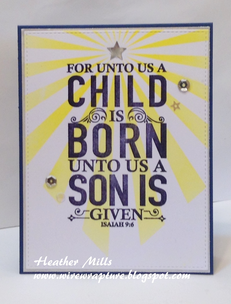 I used a starburst stencil and stamped the sentiment over top. Then I die cut the panel with a stitched rectangle die, matted it with silver and adhered it to a dark blue card base. I finished it off with some sequins (adding a star sequin to the center of the star burst as if the rays were coming out of it.)