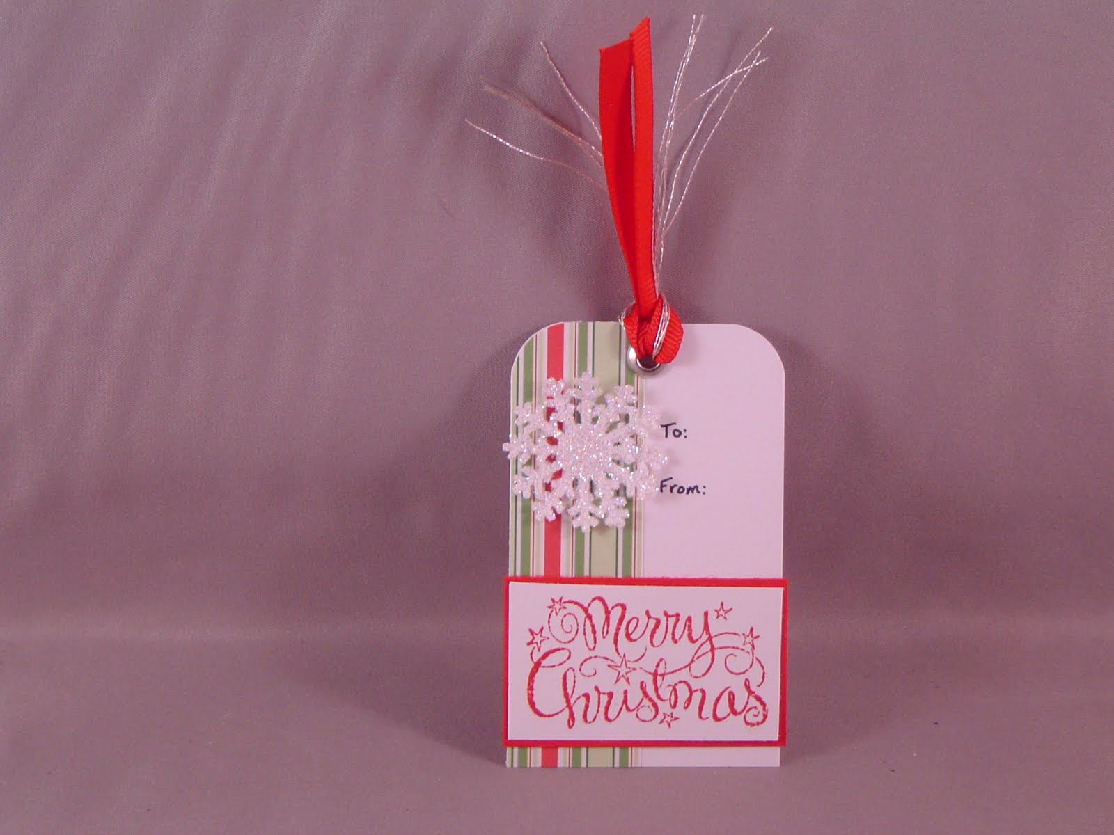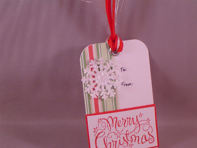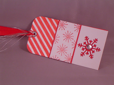 After I was part way into this project, I realized I had meant to do it in blue, and wondered why I was using red! But it still came out pretty much the way I envisioned it (minus the color difference, ha!) I created my own tag by cutting out rectangles from both red and white cardstock and then rounding the top two corners of both. I punched out the snowflake (Martha Stewart) from the white, showing the red through the negative image, then adhered a clear gem to the red cs. You can see how this works in the last picture. I stamped the snowflakes (SU!) in red and then used my glitter pen to create sparkle. I made the stripes with a red marker and ruler and added a line of glitter pen in the white areas. It's a little hard to see in the pictures, but if you look close, maybe . . . I added a silver eyelet, red ribbon and silver embroidery thread to top it all off.