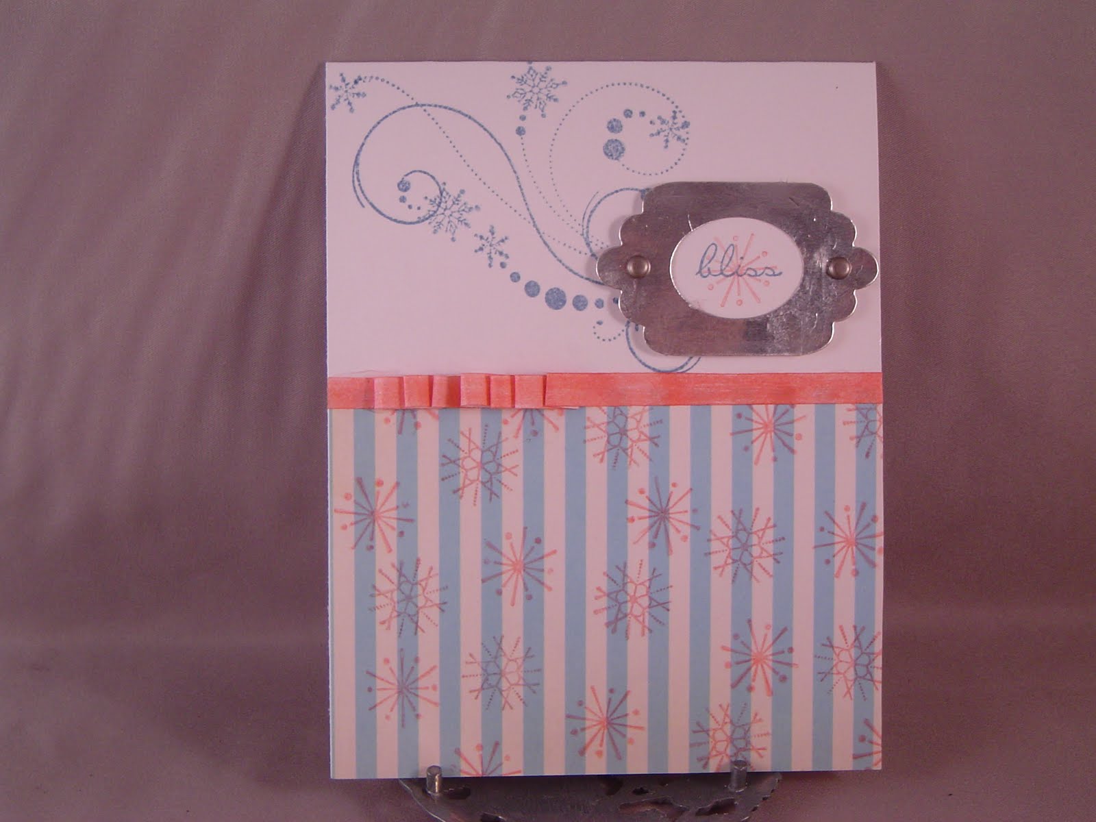 The Off The Wall Craftiness challenge for this week is to use the color combination of blue/white/peach. Peach is SO not a favorite color of mine, so it took me a VERY long time to put this combo together. But I really ended up liking these colors together, with a small dose of peach. I just have to mention that the "ribbon" is a strip of paper that I colored with the same marker that I used to stamp the snowflakes. It came out so much better than I thought.