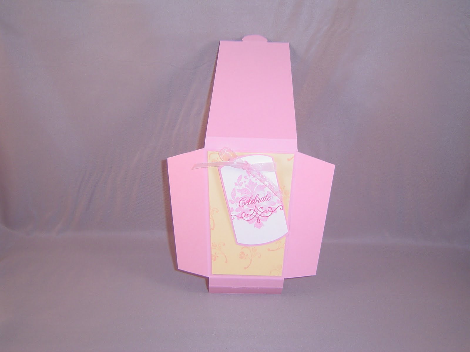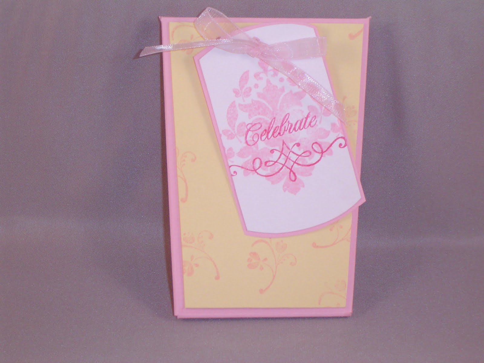 You might also recognize the card in the last two pictures. I made this card for a challenge a couple months ago and am going to use it for a birthday card for a friend. I made this little package to match, it will be just perfect for a pair of earrings for her. The card is a standard 4 1/4 by 5 1/2 inch card so you can see the size of the package in the last two pictures. The focal image is from PTI's Damask Designs as is the "Celebrate" (love that set!), the flourish underneath and the flowers on the background paper are from SU!