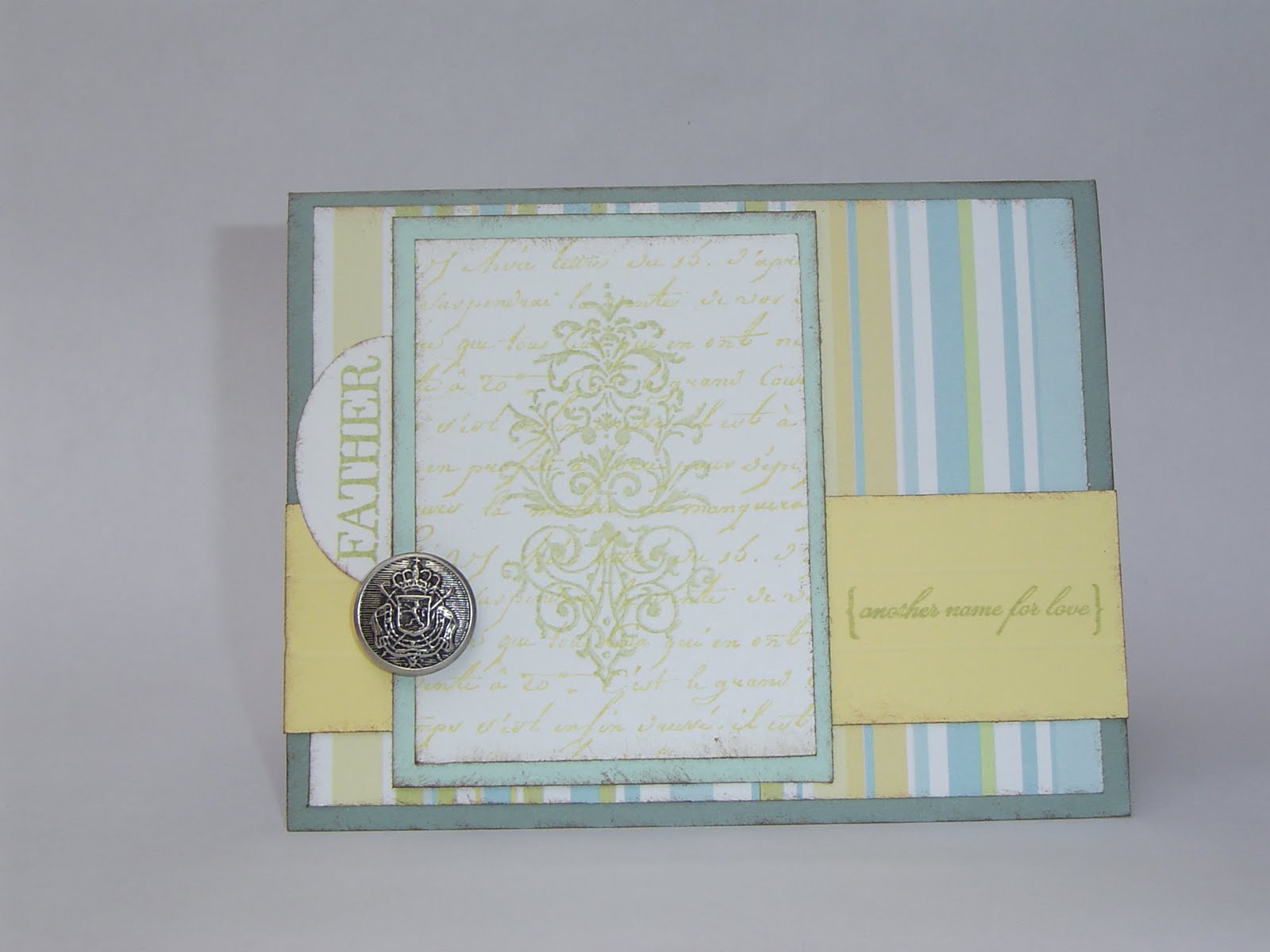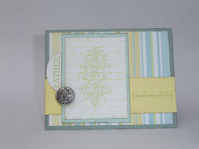 Our Daily Bread Designs challenge to use blue, green, and/or yellow. This is for my Father for Father's Day. The card stock is from PTI, the word stamps are from Verve and the Damask stamp is from Fiskars. The button, I bought a long-time ago (a left-over from a sewing project) from JoAnn's I think.