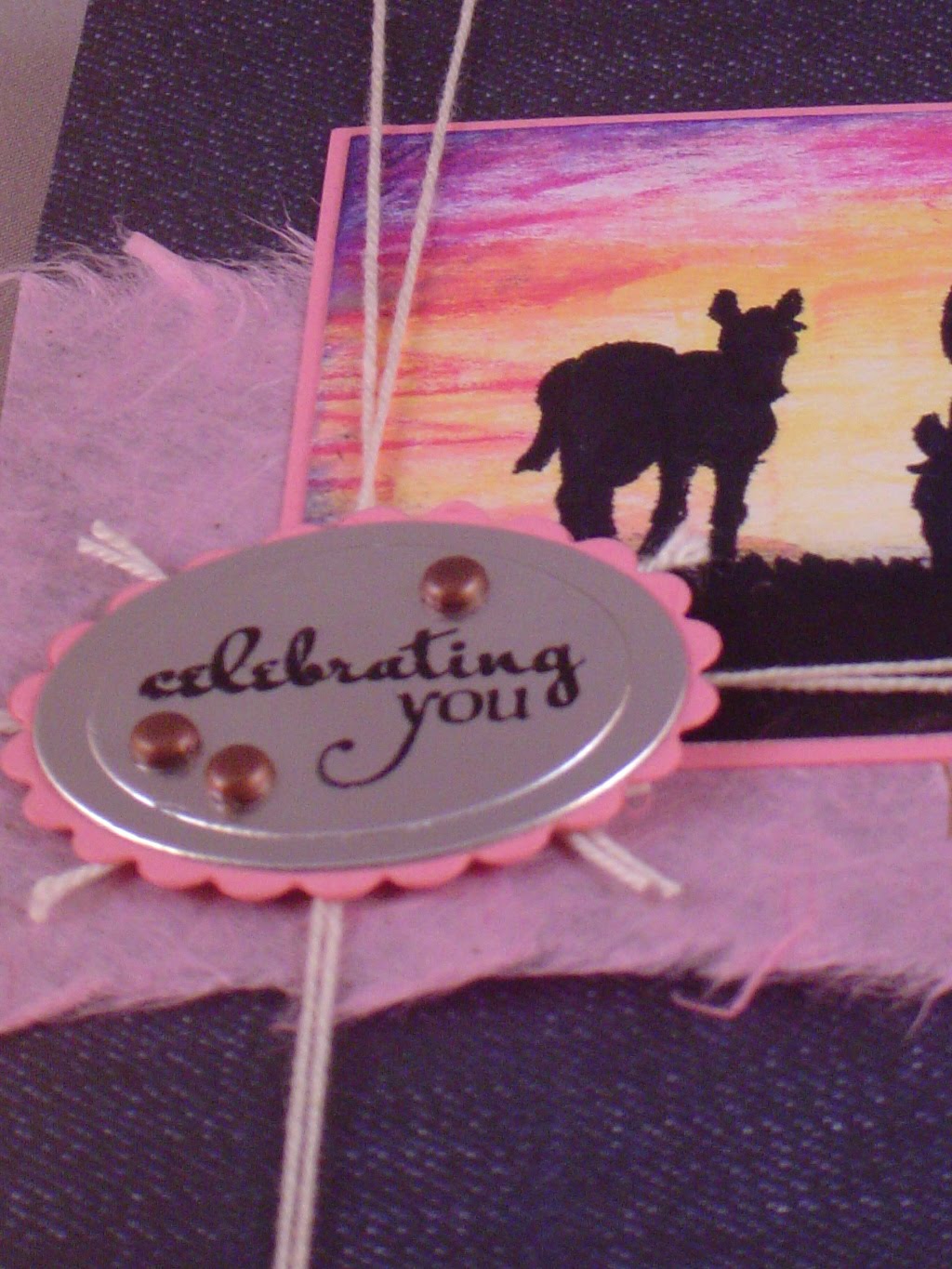 This card is for the JUGS challenge this week which is to use the theme of the Wild, Wild, West. I don't have a whole lot of "wild west" stuff, but I do have this one horse stamp set from SU! My focal image was based on this tutorial by Michelle Zindorf, but I wanted mine to have more of a sunrise look, so I went with pinks and purples. The blue jeans paper is from DCWV, pink card stock, and horse stamp is SU! and the sentiment is from Verve. One a side note, I also entered this card in Verve's Release Sketch Challenge. I also used some torn Mullberry paper; I have not used this in forever! The metal oval was created using a product I am now officially in love with. My father gave me this aluminum tape he uses for chimney liners, and it is the most fabulous thing ever. I taped it onto a piece of cardstock, cut it out and embossed it with an oval nestie, stamped it (you have to use stazon, other ink rubs right off) and added copper brads. It looks like a metal piece but works just like paper. Awesome! I finished the card off by wrapping twine around the card to mimic rope.