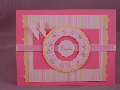 The third card used pink cs, "love" stamp and striped paper from SU! Yellow cs from PTI, and the stamp on my circle focal is from Verve. It doesn't show up very well, but I used a glitter pen to trace over the little loops at the ends of the flourishes and the body of the butterfly.