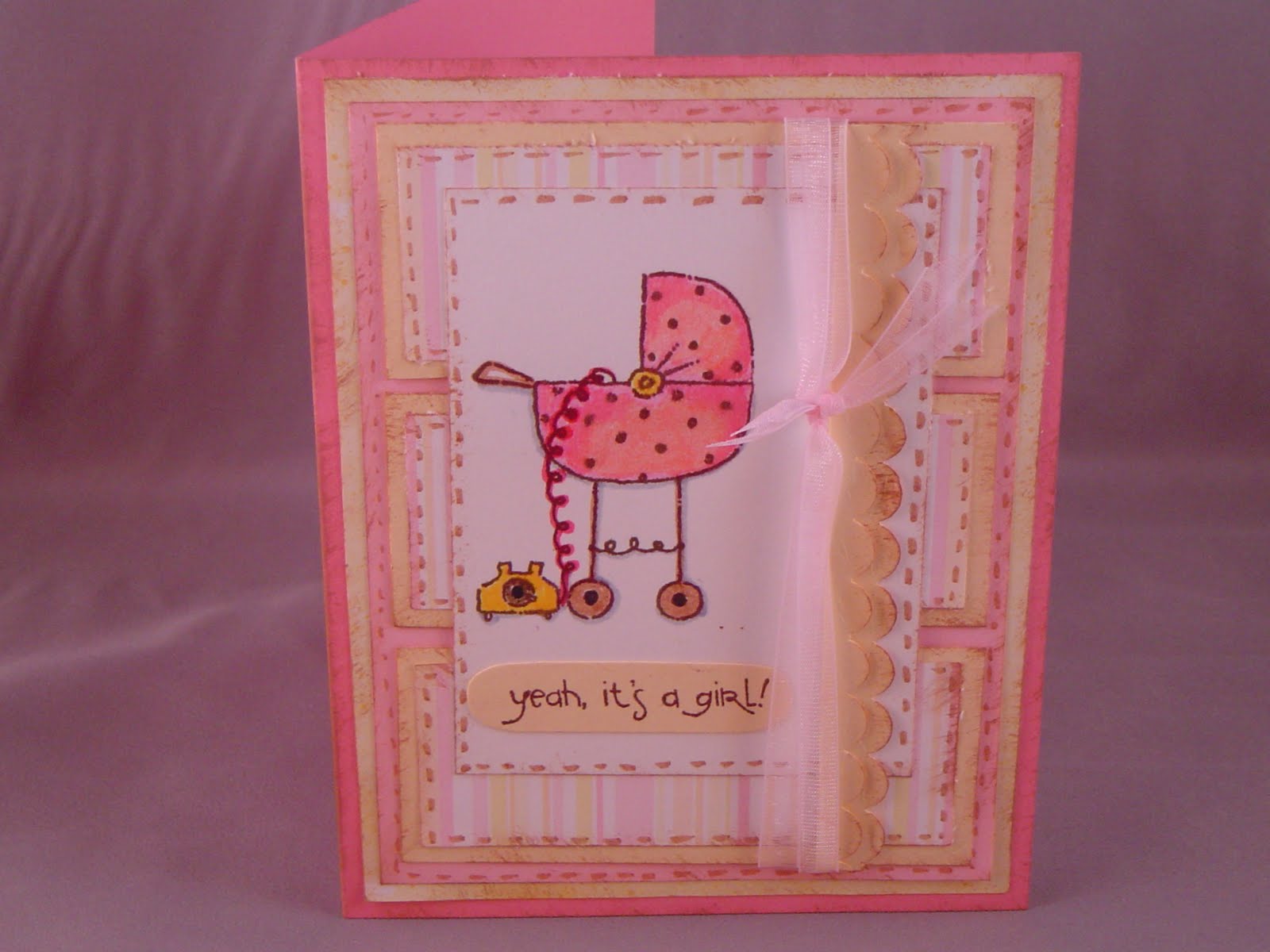 Here is my card for this week's sweet stop sketch. My cousin just had her third little girl and I am going to send this to her. The stamp, pink cardstock and striped paper and from SU! yellow cardstock is from PTI. I created a little ruffled border with two layers of cs and the scalloped punch from SU!