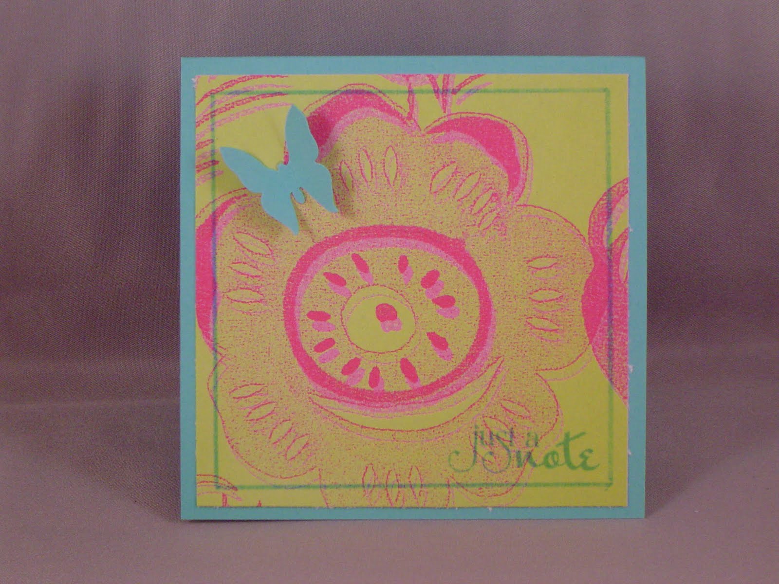 This weeks JUGS challenge is a color challenge: Teal, hot pink, lime. These are not my usual colors at all, and I wasn't going to take part in the challenge until I realized I needed a card to send to my sister. Then I remembered that I had some bright pink and lime paper that I had gotten free for something and had never used. So, I decided to give the challenge a try. My card is 3 1/2 square, so there isn't a lot of room to work with, so I had to keep it simple. I matted a piece of the freebie paper on a turquoise card, stamped the sentiment (from Verve) in the corner and drew a line around the entire paper square. Then punched out a butterfly and glued it on with the wings bent up.