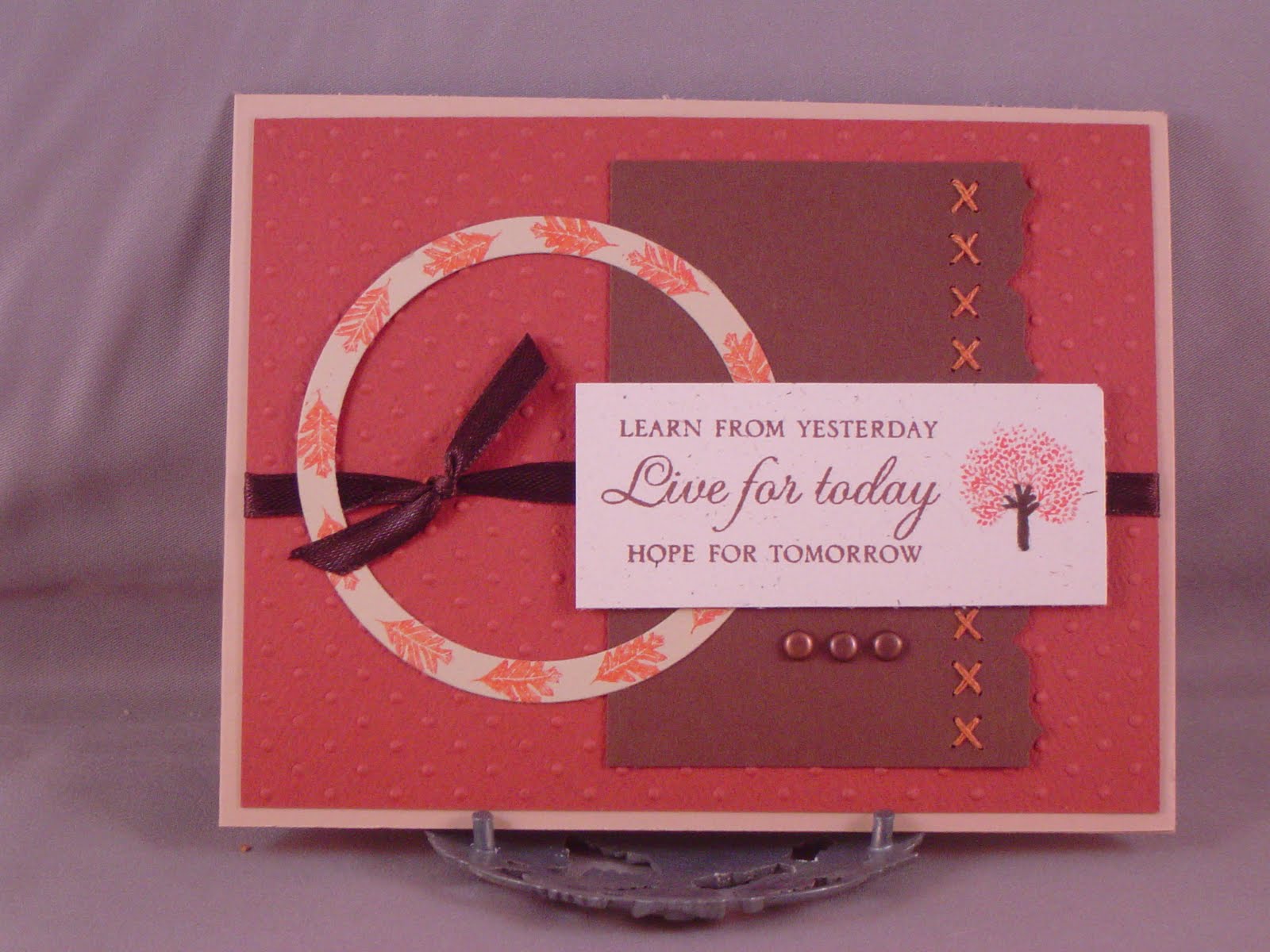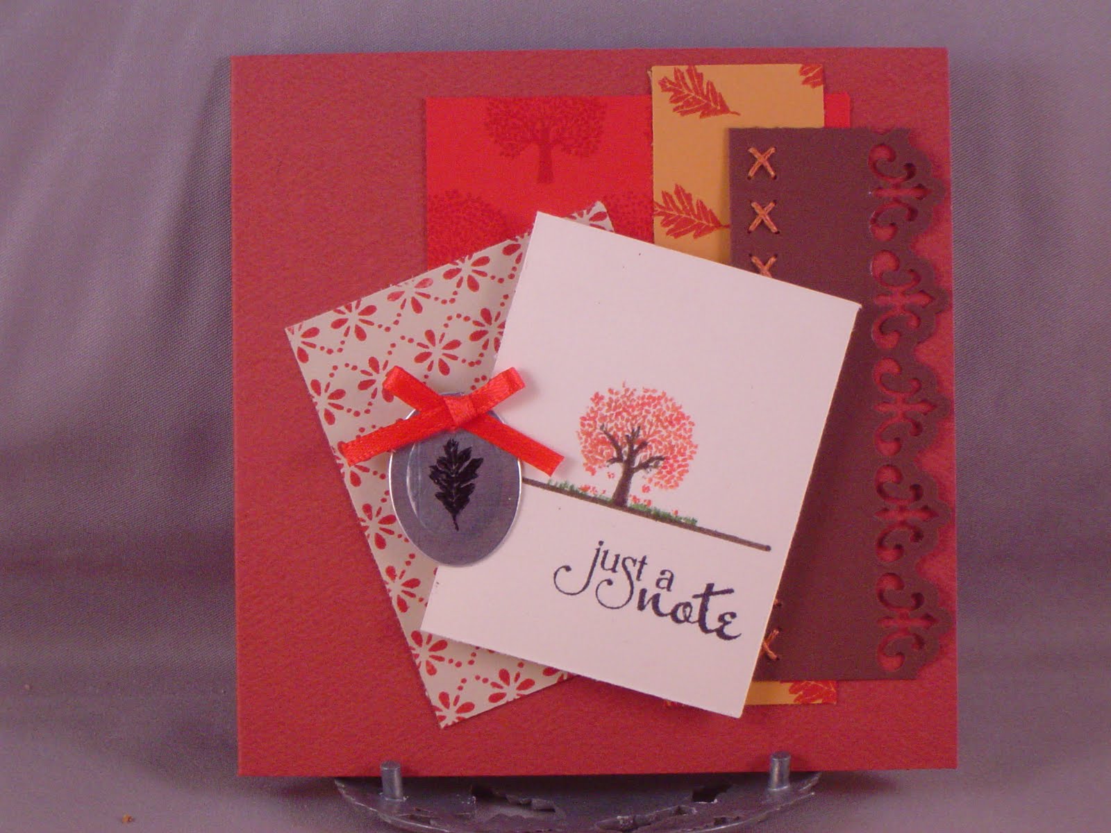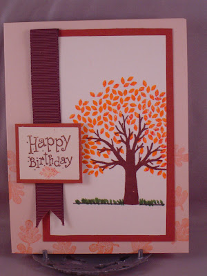 This card uses the Verve Release Week Challenge sketch #3. I just got the "through the trees" set from PTI and since it goes perfectly with autumn, I HAD to use it. Plus, I had to make a masculine birthday card, and I do not have many "manly" stamps. The background is stamped with a leaf from an old SU! set and the happy birthday sentiment is also from SU! As is the ribbon, now that I think about it.