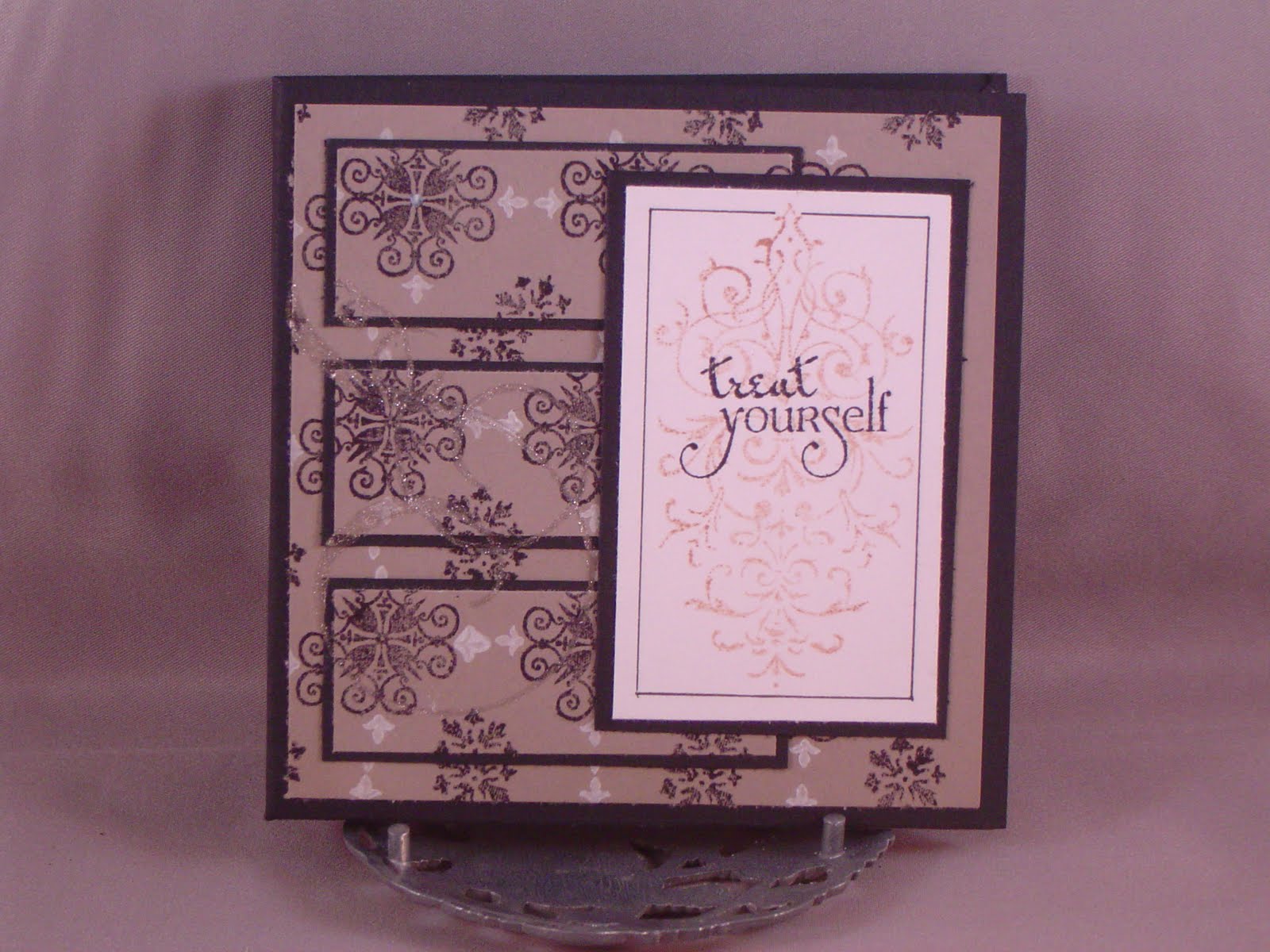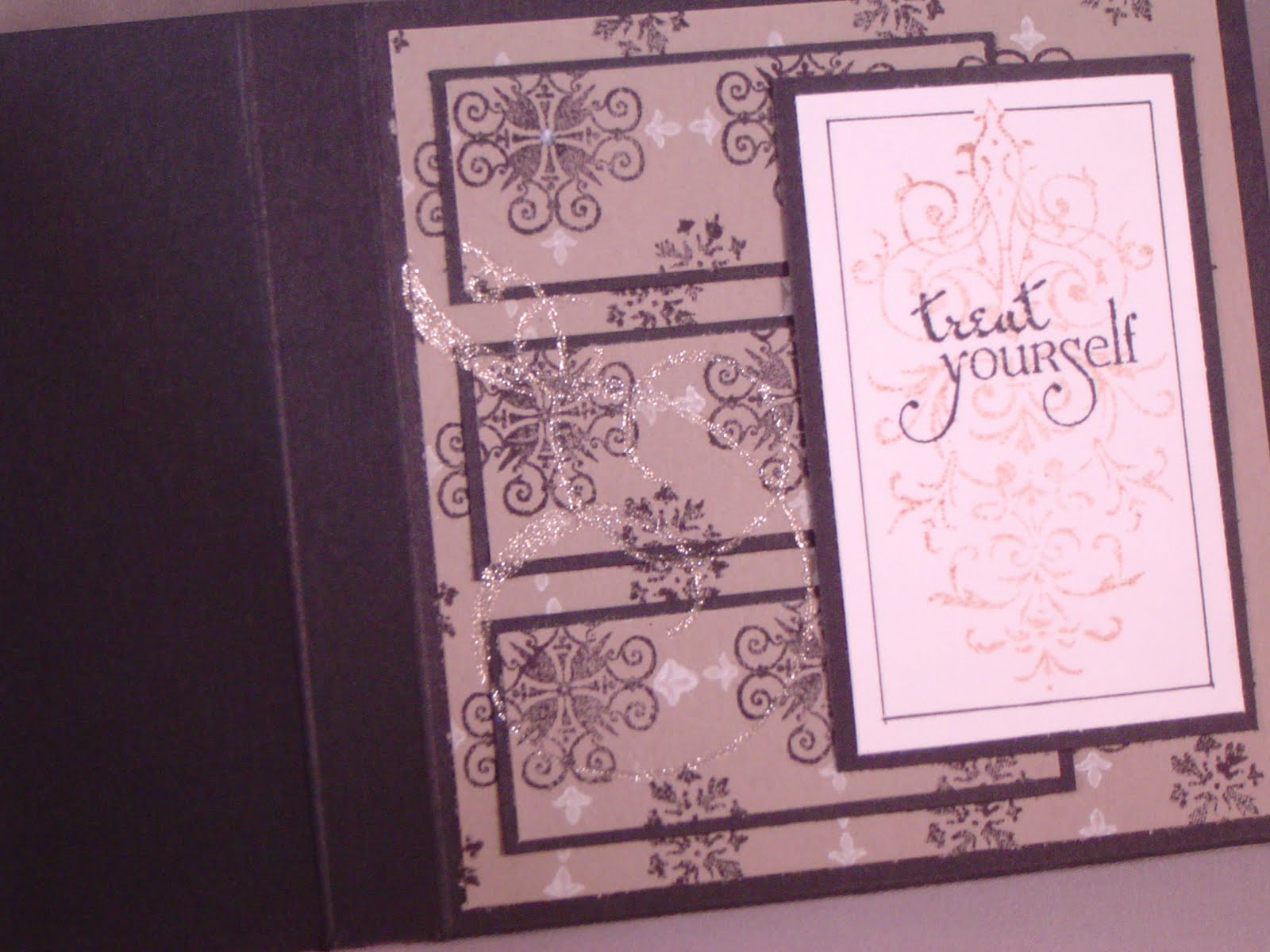 I created my own patterned paper with Guidelines 2 from PTI. I just got it, but I think I am in love! The damask on the front as well as on the earring card is from Fiskars (I think) and the sentiment "treat yourself" (by Verve) just begged to be used since the inside holds a gift card. I drew a line around the focal and the earring card using a fine black pen.