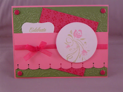 I decided to use the sweet stop sketch this week to make my sister-in-law a birthday card. I used lots of fun new toys that I had yet to try out: the scalloped border punch, cuttlebug embossing folder, and a new stamp (on the dark pink layer). The stamp is a long border stamp, but lined up next to each other it creates a embossed tin look. The flower image is from inkadinkadoo, and the "Celebrate" stamp is from Damask Designs by PTI.