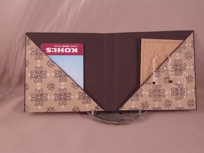 This week I used the sweet stop sketch with a spin challenge combined with the color challenge from JUGS. The spin from sweet stop was to use sparkle and the color combo was black, white, and kraft. I don't have any kraft cs so I substituted the closest I could find. This isn't a traditional card in that I made it to hold a gift card and a pair of earrings I made for my sister-in-law for her birthday. It is based on this tutorial, but I scored a half inch spine in the middle to accomodate the earrings.