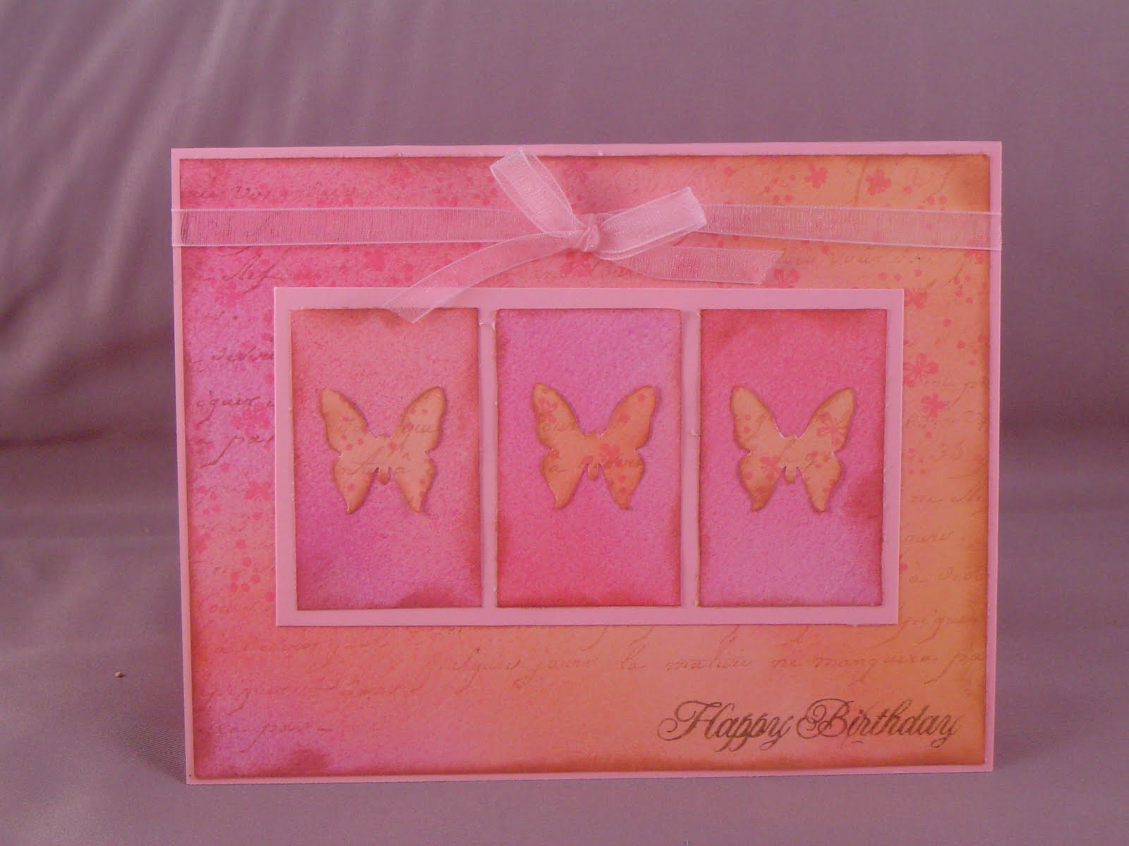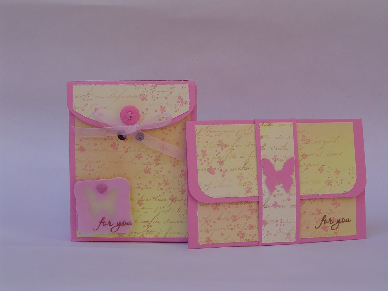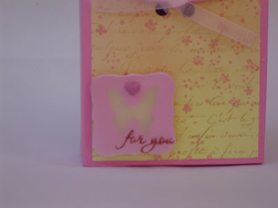 This weeks JUGS challenge was to use a template, preferably from MTME. The JUGS team is showcasing the "In Suspense" template, which I have, but have not made anything with yet. Instead I chose to use "cutesy cover". It was the perfect size to hold a single image volkswagen bug clear stamp I bought my mother-in-law for her birthday. The second picture shows the box with a gift-card holder I also made for her. The cardstock is from SU! the background paper is a piece from DCWV that fades from dark pink to yellow. I jazzed it up a bit by stamping a French script background stamp in creamy caramel and then stamping a small multi-butterfly stamp in a pink from Martha Stewart. I AM determined to use the old DP (or at least a large amount of it) that I have before I buy any of the new gorgeous stuff I have been seeing lately. I punched two holes to run ribbon through and tied it around a button stuck on with a foam square.