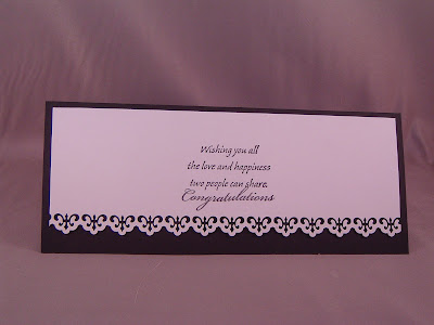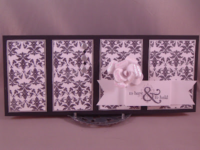 How can you not love black, white, and silver together?! That was the Off The Wall Craftiness colors for their challenge this week. I combined it with the Verve sketch challenge to create a wedding card for my cousin who is getting married this weekend. The damask stamps are from Damask Designs by PTI. The sentiment on the front is from American Brands-Wedding and the verse inside is SU! This was my first attempt at making a 3-d flower. It would have been much easier if I had the 6 petal flower punch instead of the 5 petal one I thought I needed. : )