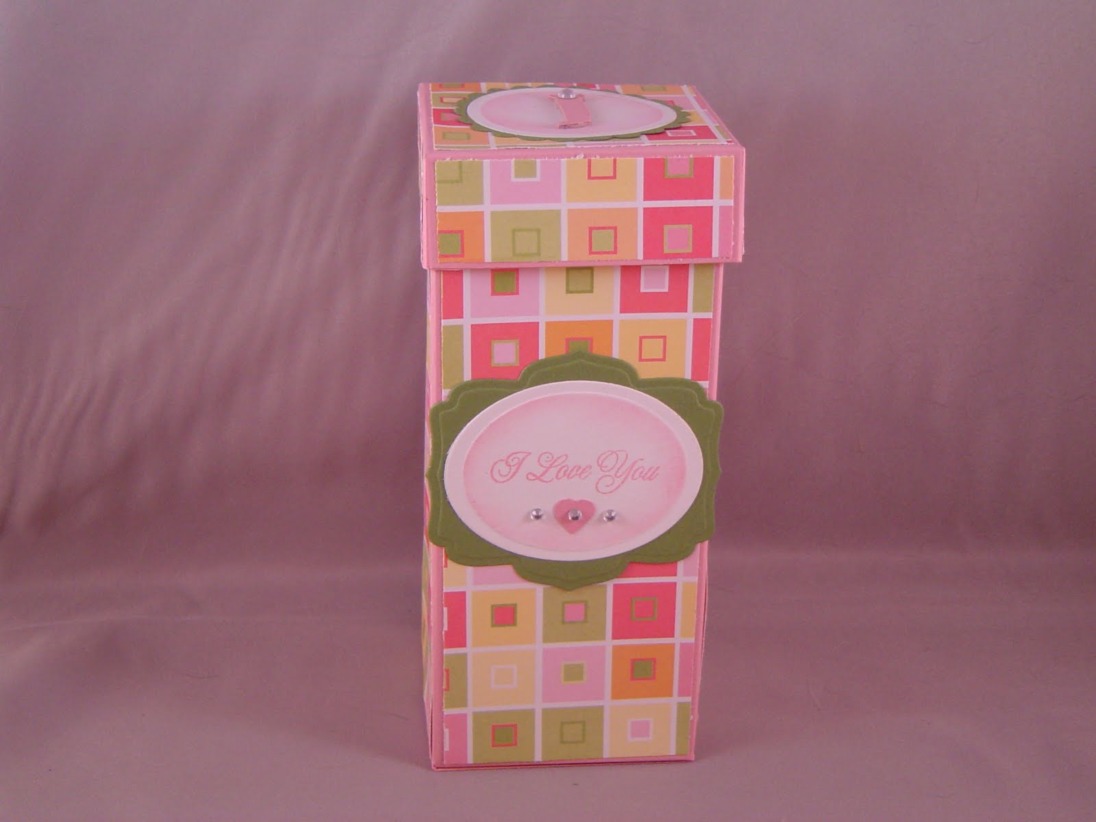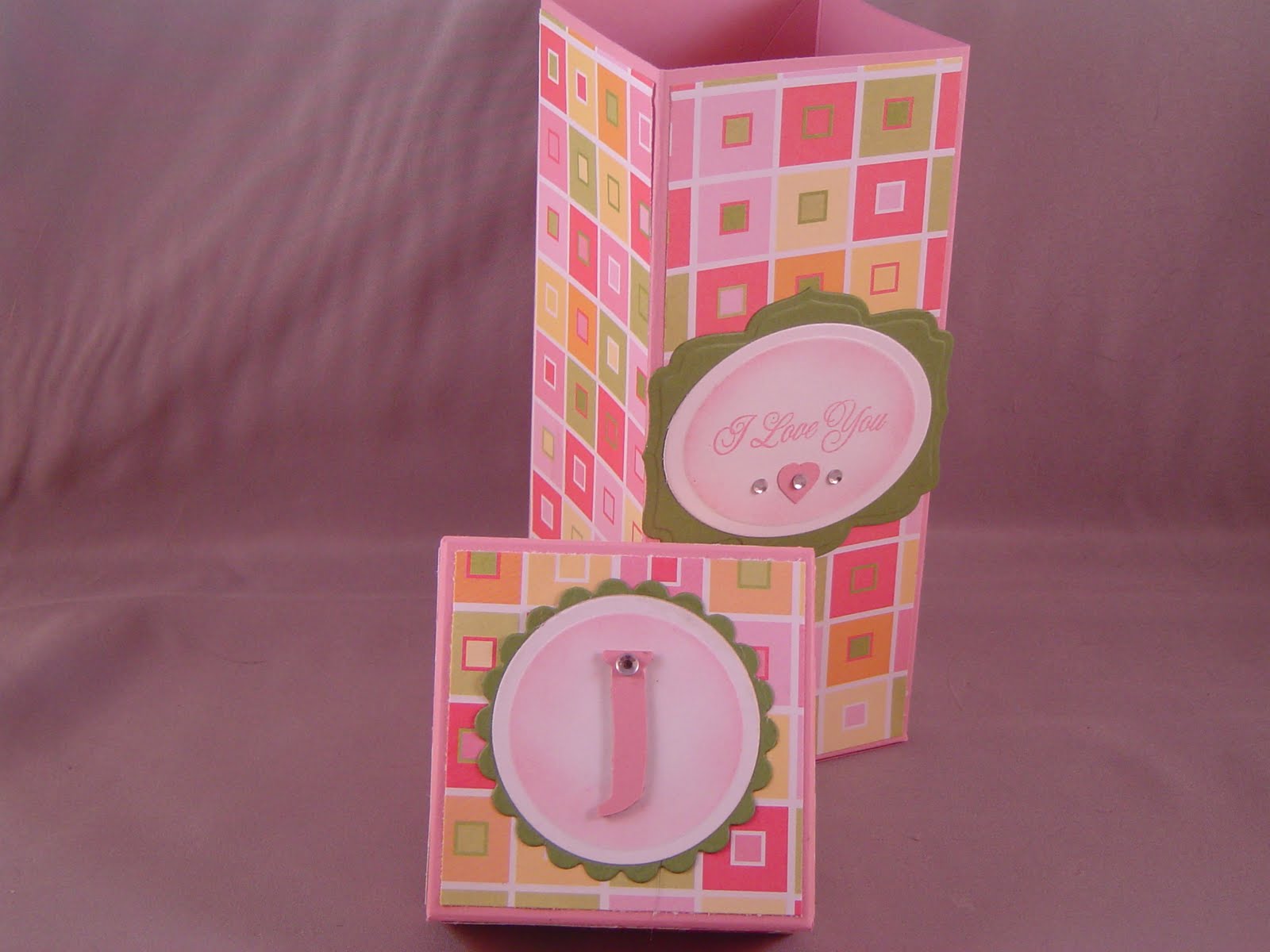 The JUGS challenge for this week was to create a 3-D project. I was looking for something to hold a Valentine's gift (which I don't have yet, so it had to be versatile) for my girls. I ended up making my own box which measures 6" tall by 2 1/2" wide and deep. It should be good for a bit of candy and hopefully a cute little stuffed animal. This box is for my oldest daughter and her name starts with "J" so I decorated a chipboard "J" for the top. The "I love you" stamp is from Damask Designs by PTI (I love this set!!!)