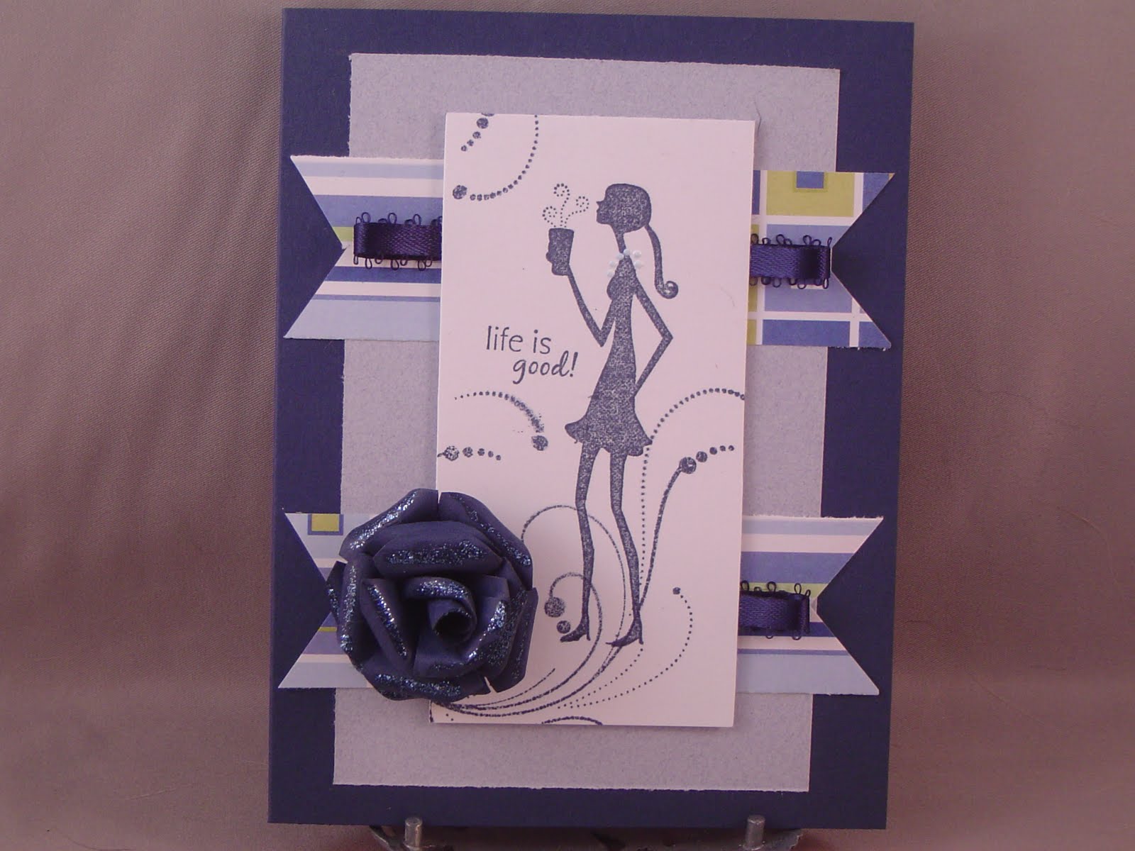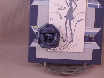 Blue was the theme of this week's Our Daily Bread Designs challenge: use blue and not just a little! I combined that with the JUGS challenge to create a 3-D flower to create this card. I also used the sketch from Sweet Stop this week. The focal image is from "She's all that" by SU! and a flourish by Inkadinkadoo. I all ready had these sets out (see my previous post) and thought they fit in with the sketch and the 3-D flower (which comes out so much better when you use a 6 petal flower instead of 5!) It might be a bit hard to see in the picture, but I added some white demensional fabric paint to the pearl necklace to give it a little something extra. The flower is gigantic--I definitely won't be mailing this!!!