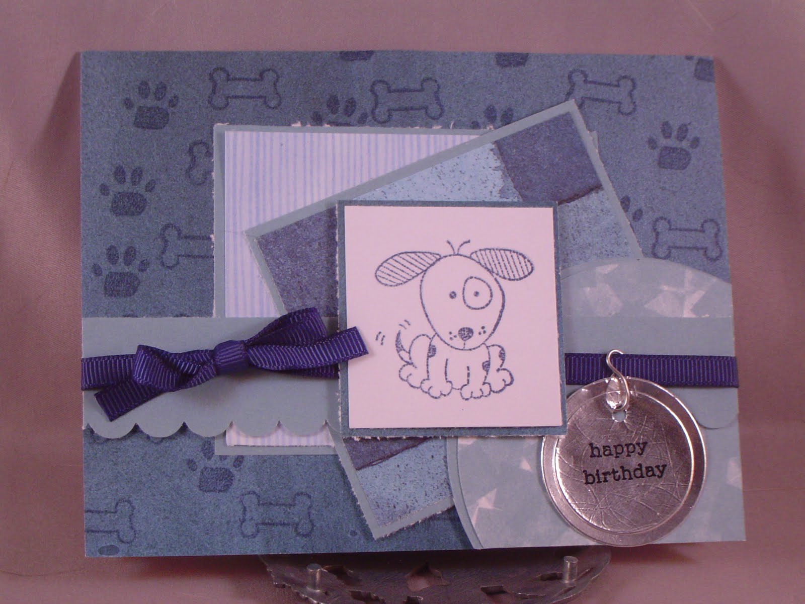 This card uses the sweet stop sketch for this week. I used a new little stamp set I bought at JoAnn's (I think) for a dollar. I thought the puppy was adorable. It also has the paw print and dog bone stamps I used on the background paper. I made a cute little "happy birthday" ID tag with aluminum tape and a circle die then made wire s-loop to attach it to the ribbon "collar".