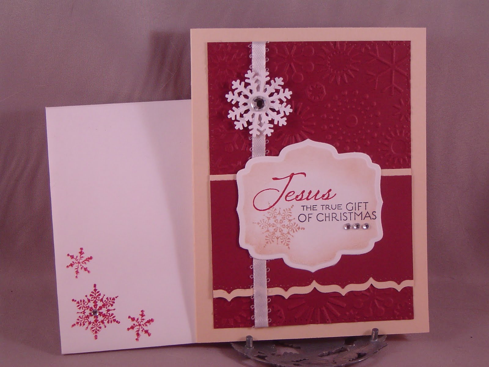 For my something new: last week I just received the "Richly Blessed" set from Verve and I used the "Jesus" and "the true gift of Christmas" sentiments. Old things are the snowflake stamps (inkadinkadoo, I think) and all the cardstock.