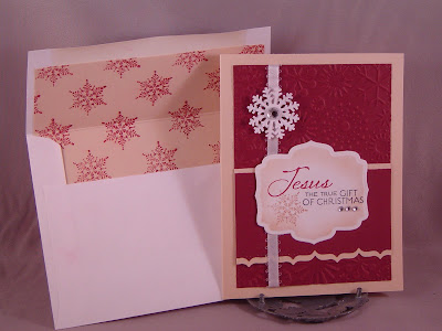 Yes, I am starting Christmas cards all ready! This year I was sending them out (ok, I was making them) the week of Christmas and I vowed I would start making cards in January and continue throughout the year so that wouldn't happen again. So, the challenges from Verve (the sketch for Viva La Verve), Our Daily Bread Designs (used something old and something new), JUGS (Envy of Envies--decorate & line the envelope), and Off The Wall Craftiness (color challenge, see the last picture in this post) were the perfect chance to start.
