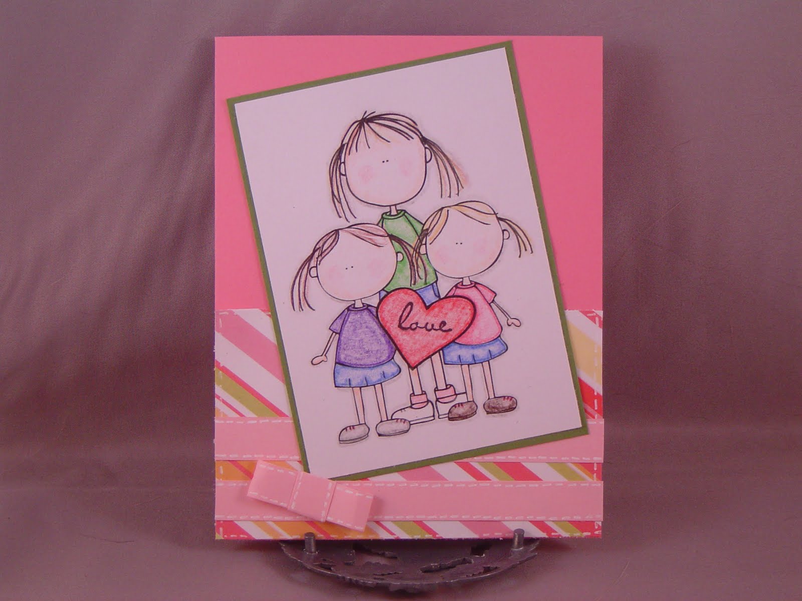 Verve has started a new challenge they are calling their Diva Dare; this month's theme is Baby Love--either celebrating a new baby or love (or both, I guess). My card is for my Mom (and Dad) for Valentine's Day. The image is from a fabulous package Jak Heath has put together to raise money for a woman named Katie who is battling cancer. You can visit this site to read the entire story and see the package of digital images from several fabulous artists/companies. I think this image is supposed to be Katie's three boys, two of which are twins. I adapted the image to fit my family of three girls (I also have a set of twins), by adding ponytails to the hair and pleats to make the shorts into skirts. I also stamped love into the center of the heart. My "ribbon" is actually two strips of paper that I added "stitching" to with a white gel pen and used a third strip to make the bow.