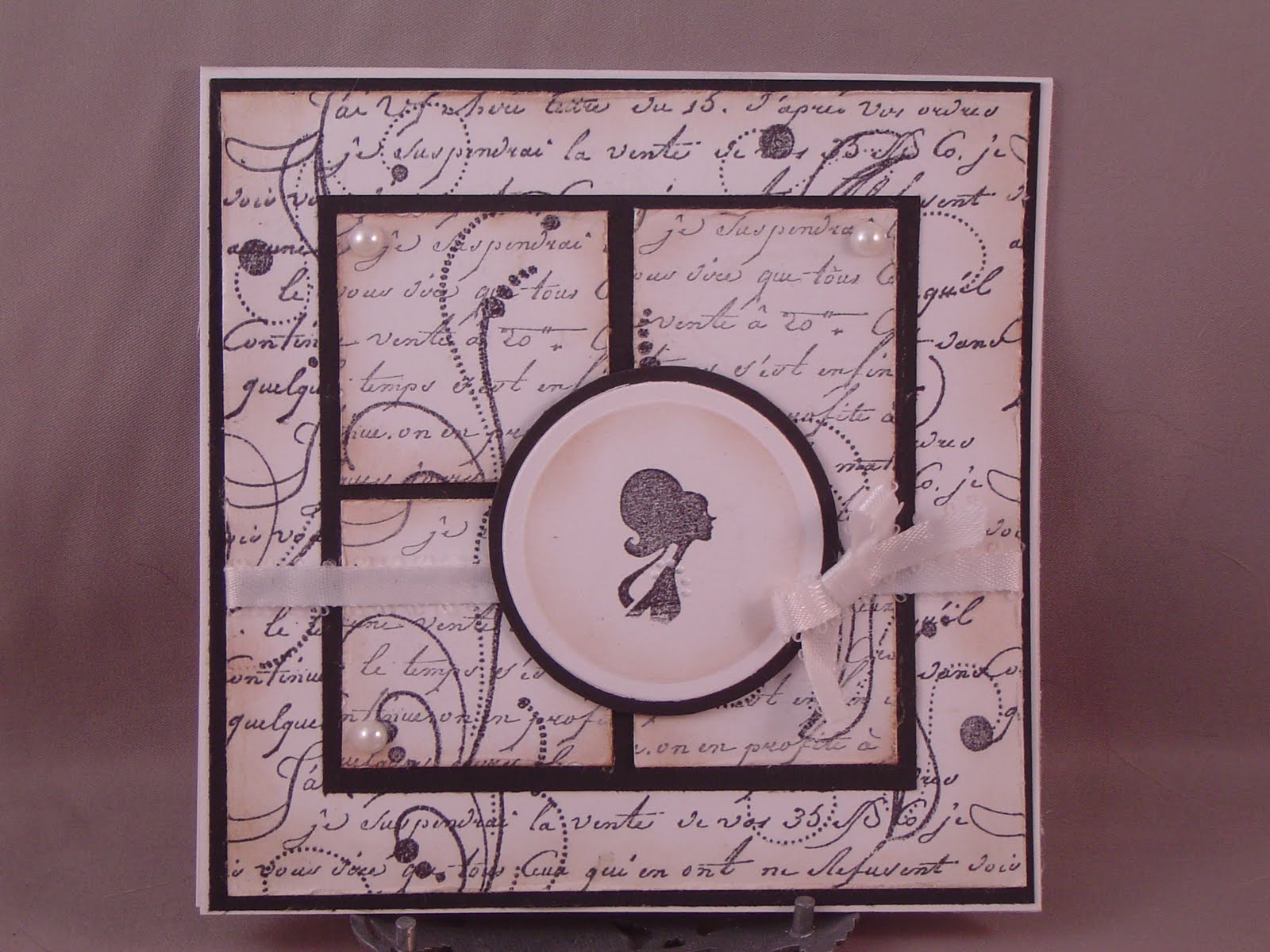 I always seem to not have the "right" item to use and have to alter something else to create what I need, but maybe that is part of what is so great about stamping and papercrafting: if you can think it, you can usually do it! I never have the "right" patterened paper for anything, this challenge included, so I had to make my own using a French-script stamp topped with a flourish by Inkadinkadoo. I haven't been one for distressing, but I am starting to see the beauty in it, so I also added a little tan ink to the edges to take away the stark contrast. I also didn't have a cameo stamp, so I taped off the body of this image from She's All That by SU! and voila, a cameo.