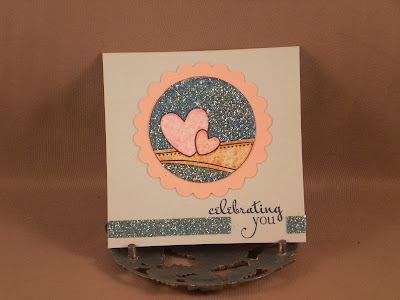 The second card uses one of the free downloadable tags PTI created for their 4th anniversary festivities last month. I had colored it in before I figured out what to do with it, resulting in something that I was less than happy with and having a hard time incorporating into a project. But, inspired by the turquoise glitter (Martha Stewart) I used on the glitter strip, I added glitter to the top and bottom sections, and voila! It fit perfectly!! The sentiment is from "Celebrating You" by Verve and I thought this would make a perfect lunch box note (sized 3" square) for my husband, but it might also make a cute birthday gift tag.
