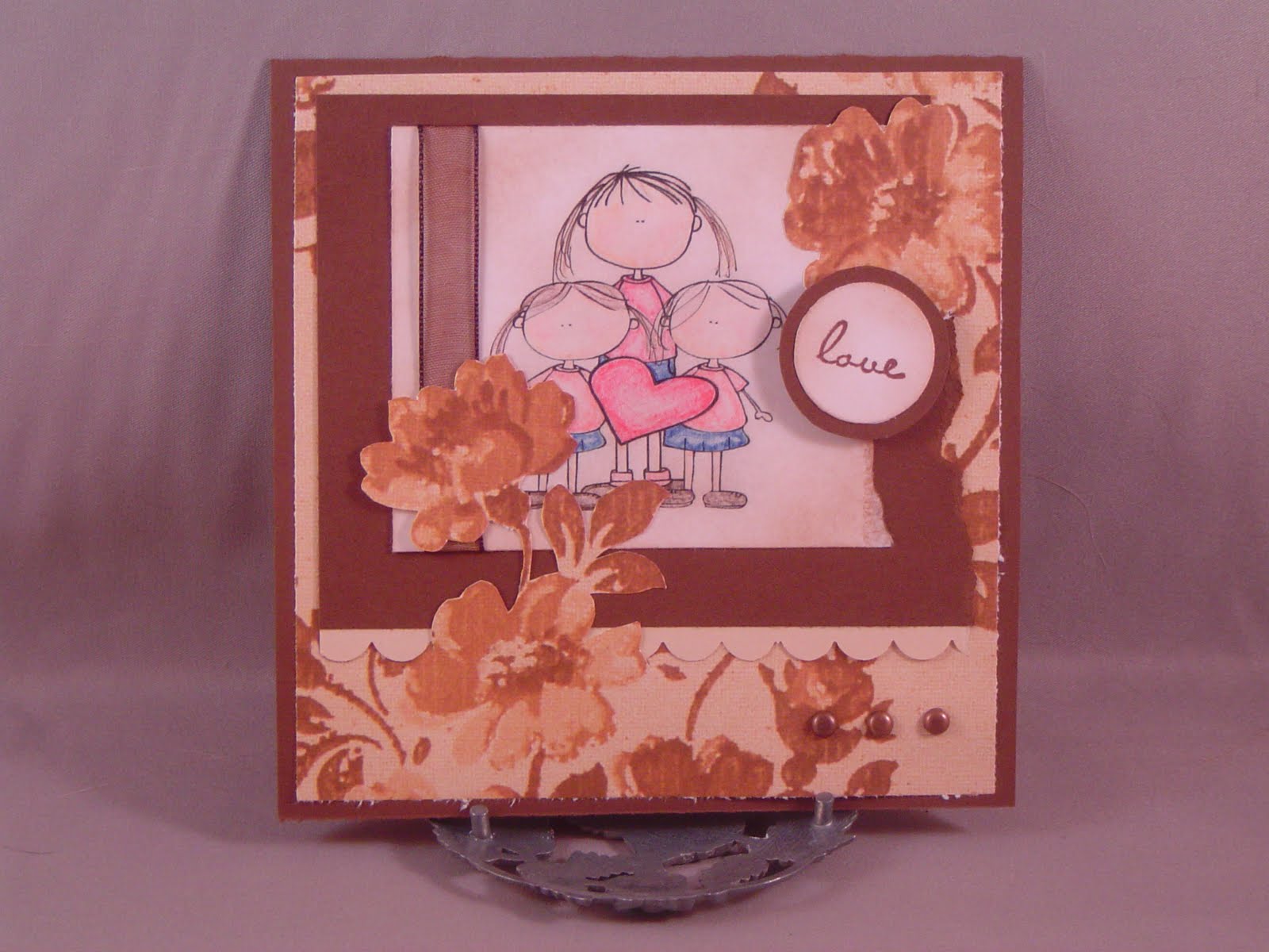 This week's Sweet Stop sketch challenge is the inspiration for this Valentine's Day card for my in-laws. The digital image is from by lori designs and was part of a fantastic package put together by Jak Heath; donations to benefit a young woman named Katie who is battling cancer. Check out Jak's site to read the whole story. The image is supposed to be three little boys (representing Katie's boys), but as I have three girls--two of them twins--I added pigtails and pleats to the shorts to make them skirts. The love stamp is from SU! The card also fits the theme of Off The Wall Craftiness this week which is to use hearts and/go vintage. Now I'm not a vintage girl, but I did age the image with brown ink to soften it up a bit, and there is definitely a heart.