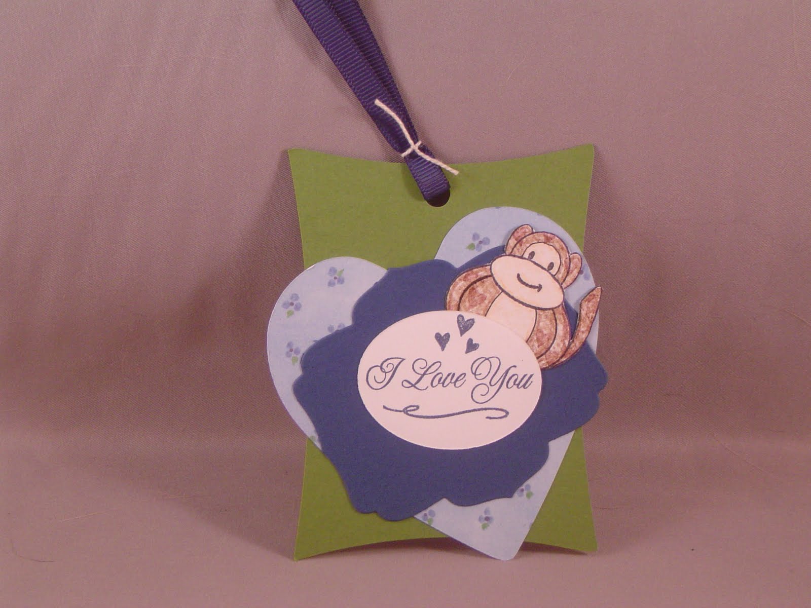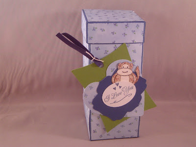 The challenge Nicole Heady issued today for the Papertrey Ink festivities was to use something unexpectedly big on your card/project. I was at a loss until I remember she mentioned huge tags, so I made this little (big) number. It doesn't seem all the big, and it really isn't, but compared to the box it is going on (see second picture), it is HUGE!! This is for my middle daughter for Valentine's Day. She has a special little monkey that looks a whole lot like this guy, so cute! He is from "To the Moon" from Verve as is the little heart trio and swirl under the sentiment which is from Damask Designs by PTI.