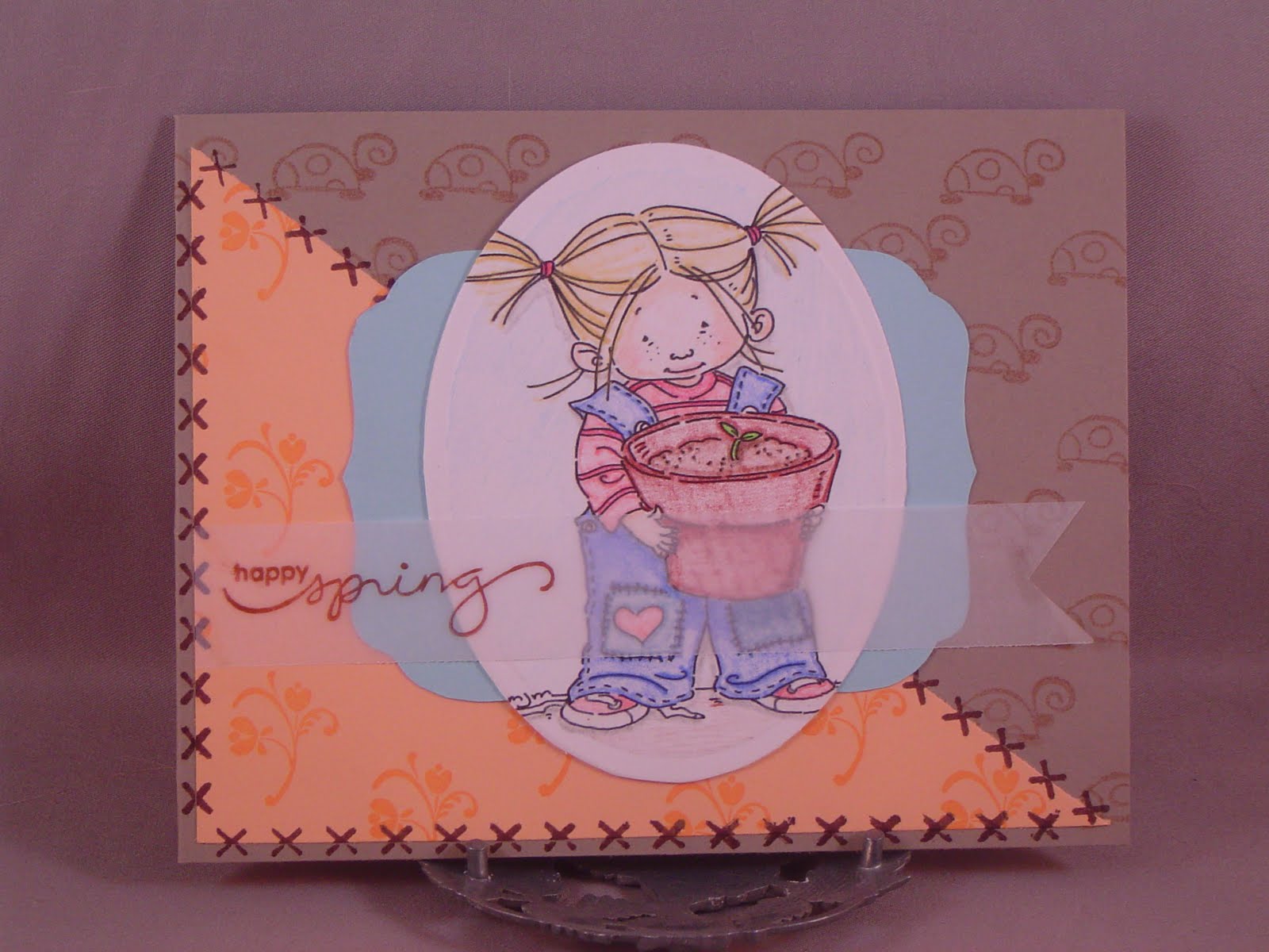 Even though here in the northeast we are supposed to get snow again tonight, spring is coming!! This card combines the Viva La Verve week 4 sketch, JUGS #72 color challenge (kraft, melon berry, light aqua), and the PTI Make it Monday vellum sentiment challenges. The image is from Jo Manning and is part of the digital image package Jak Heath is offering to raise money for a friend just diagnosed with cancer. Check out her site to see the rest of the package and read the story.