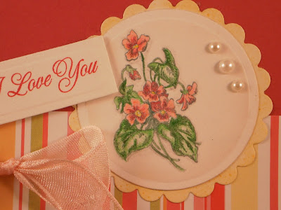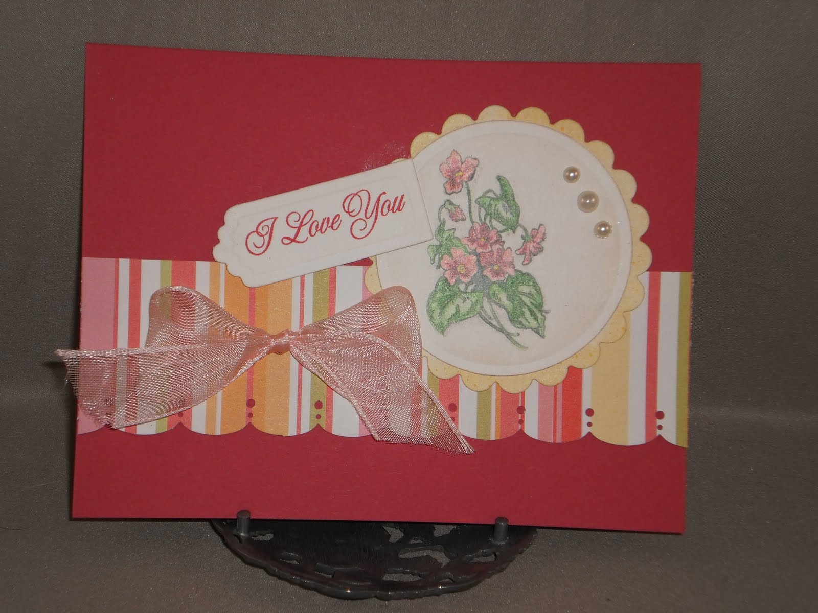 Today, I have combined the Sweet Stop sketch for the week and the Our Daily Bread Challenge to use dies & punches (It is the one year anniversary of their weekly challenges and so they offered several different challenges from the past year to choose from). I used circle, scalloped circle, and scalloped nestabilites dies and a Martha Stewart border punch. I'm not sure where the flower stamp came from (one of those random rubber stamps you have floating around), but the "I love you" stamp is from Damask Designs by PTI.