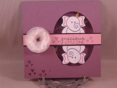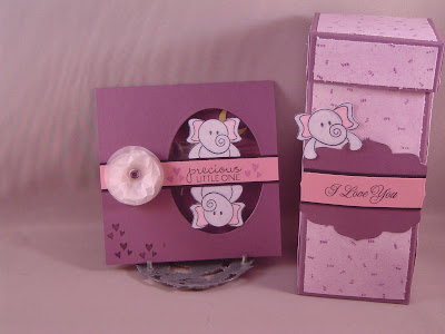 This is the Valentine's Day card for my youngest daughter using this week's sketch from Waltzingmouse. I had to sit and think for a while on how best to really stay true to the sketch as it really caught my interest! I cut out the window using one of the oval nesties and backed it with acetate so I could suspend the adorable little elephants. All the stamps are from "To the Moon" from Verve; look closely and you can see I stamped and cut out the moon from the set and adhered to the inside of the card so it peeks out the window. The last picture shows the little matching box I made to hold her treats.