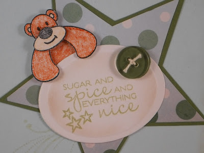 My oldest daughter's birthday is next month and I am getting a jump on things this year. This is her birthday card; she has a little stuffed bear (Ty Pluffy, Slumbers) that looks just like this little guy (at least the way I colored him!). This is the Waltzingmouse sketch for this week. The bear (which I stamped and colored three times then cut out various parts and popped them up on pop dots), sentiment and stars are from "To the Moon" by Verve, the flourish is from Inkadinkado. Papers are all DCWV. The button is a clear button; I traced around it onto green cardstock, cut it out and tied it to the button with twine.