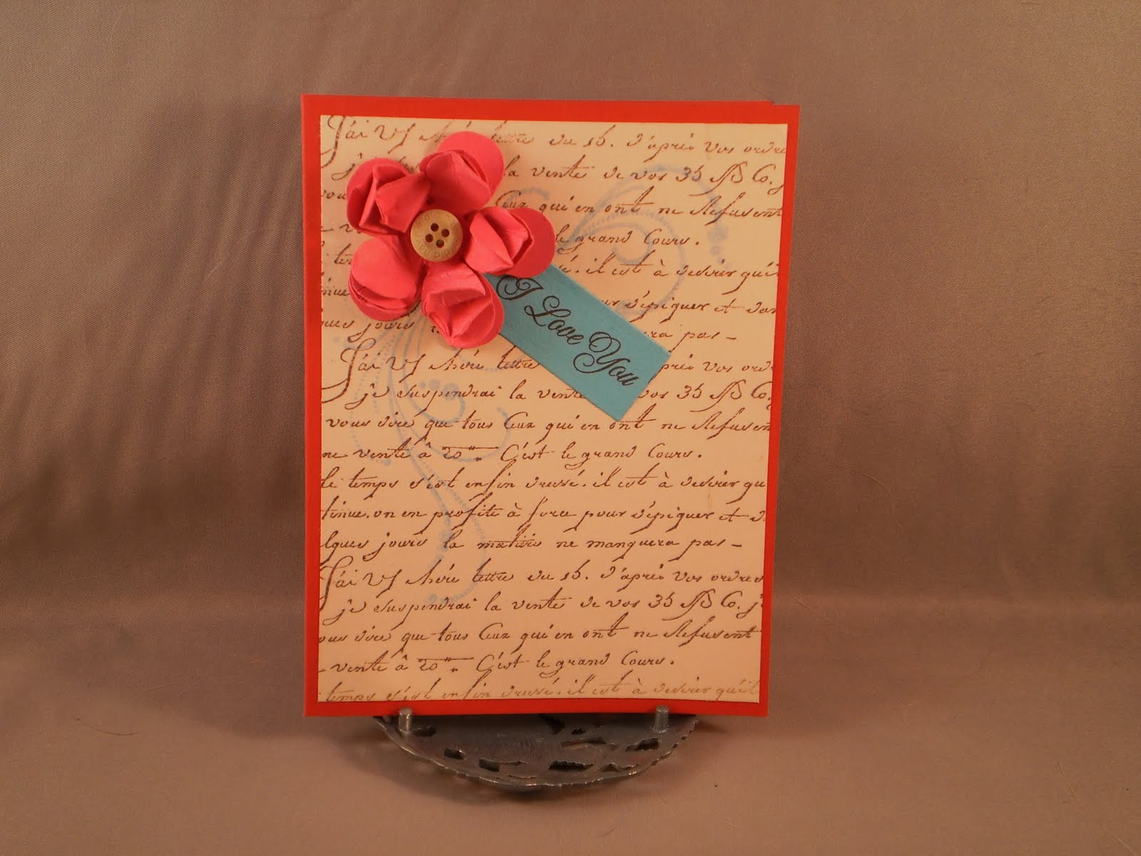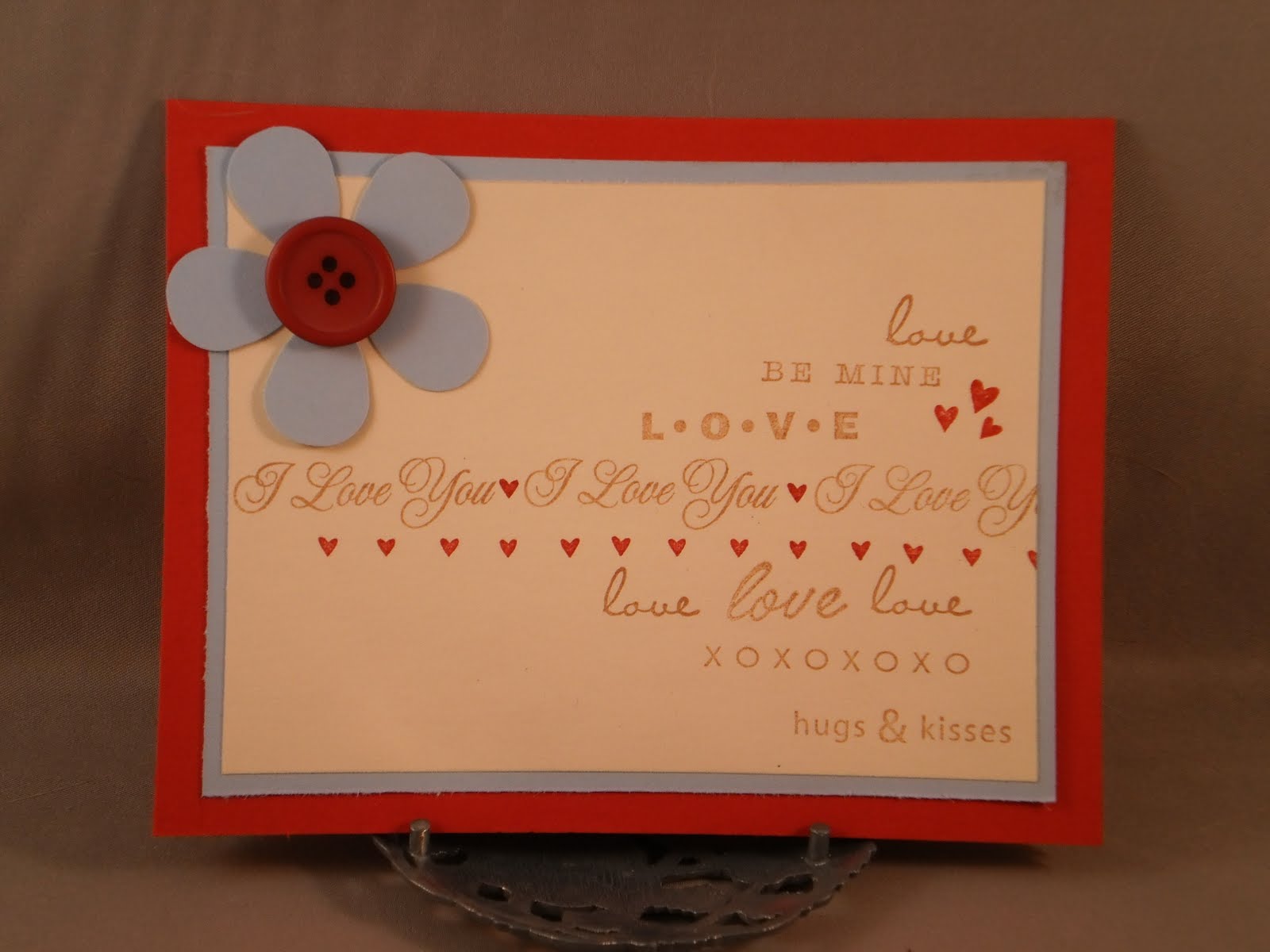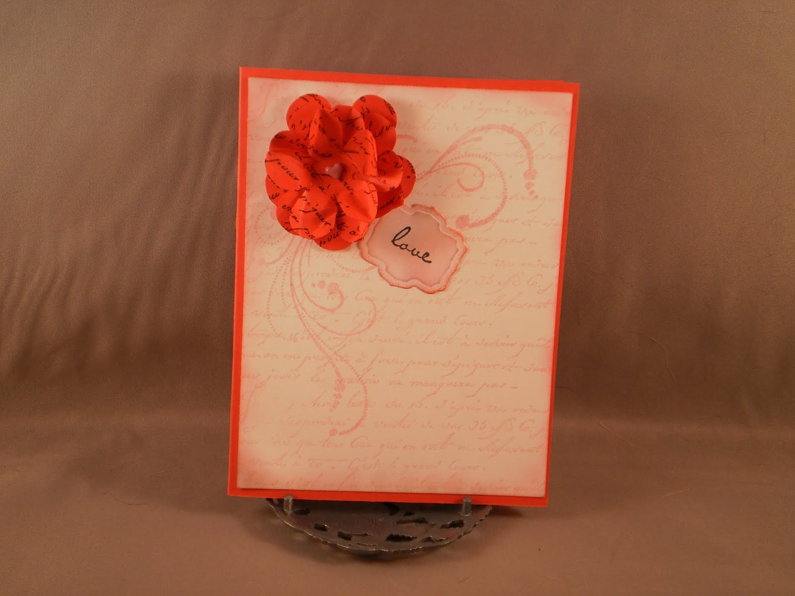I'm still stuck in Valentine's Day card making, so the Off The Wall Craftiness challenge to use white/red/pink fit in perfectly. I also use the JUGS sketch challenge for this week. Stamps are a random French script, flourishes from Inkadinkadoo, and the "love" is from SU! My red flower and card base look a bit pink in the picture, but they are more red in person.