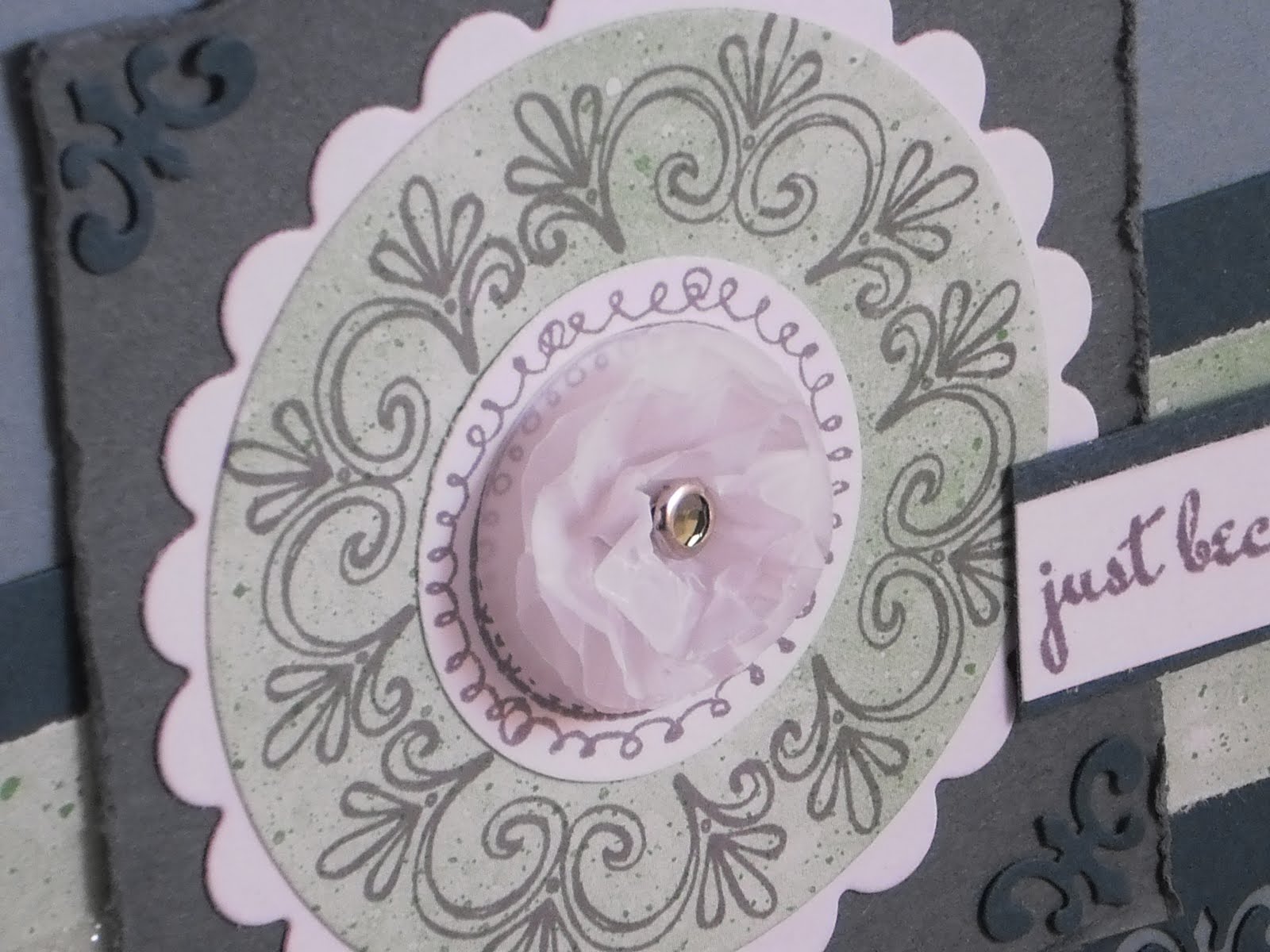 I was all set to enter this card in the Papertrey Ink "Make it Monday" challenge which was to use a strip of scor-tape covered in glitter, and combine it with the Mojo Monday sketch challenge, but realized I was using way too many Verve products and needed to feature some PTI so I made the second card in this post but I'm too lazy to do two postings. : ) I appologize. Anyway, the card stock base is ocean tides from PTI, I have no idea where the darker greens came from. The stamps are from Verve "Accent notes" and "Celebrating You. And there is a glitter strip running down the center of the horizontal panel (a little hard to see). The second picture gives a better picture of the dimension of the flower in the center of the medallion. It is 4 or 5 circles punched out of vellum, scrunched up and held together with a jeweled brad from SU!