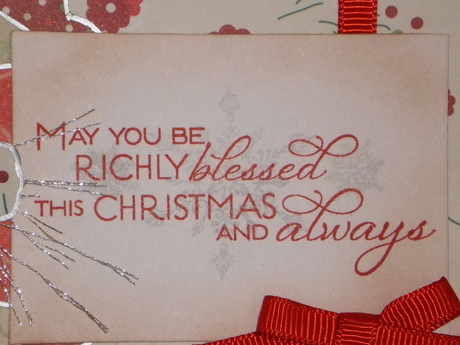 Yeay! Another Christmas card down AND something cleared off my workstation! I had two parts of the medallion sitting on my desk for at least two years just waiting and this card was the perfect opportunity to use it. This is the Mojo Monday sketch combined with the Our Daily Bread Designs challenge to stamp an image over a sentiment. The papers are all from a DCWV Christmas paper pack. I used a Hot Off the Press nested shapes template to create the shapes and edged them with a silver pen, adding a little big of silver thread under the top shape. Ribbon and red ink are from SU! The sentiment is from Richly Blessed by Verve overstamped by a large and two small snowflakes (in silver) from Inkadinkado.