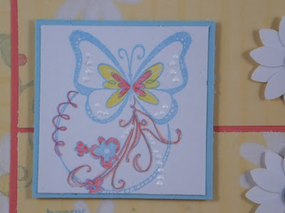 More springy cards! The card combines the Sweet Stop sketch with a spin (think spring) and the Off the Wall Craftiness color challenge (pink/yellow/blue). The butterfly image is from Inkadinkado that I stamped in blue, colored with colored pencils and added white dimensional paint (see the second photo).