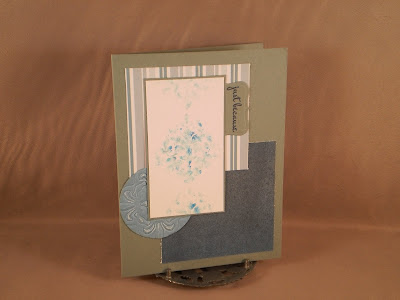 Hi, all! I'm back after a {forced} two week hiatus due to computer problems. But a wonderful friend fixed me up and I'm all set to go. Yeay! This card used the Pretty Palette 02 (from My Time Made Easy): white/blue/green/brown (although they have some nice SU! names for them) and the JUGS 78 sketch challenge. This stamp is one I have had from last summer (from Clear Dollar Stamps) and have yet to use. The happy birthday stamp is from Damask Designs by PTI. The papers are all DCWV and I thought the blue looked like ripples in water.