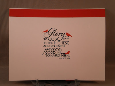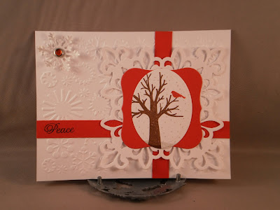I am slowly accomplishing my goal of having my Christmas cards finished in plenty of time for Christmas this year: I have 7 done so far! Not a lot, I know, but 7 more than this time last year. This card uses the sketch for Viva La Verve April week 1, allthough it is a definite stretch. I am usually very strict in my interpretation but I just couldn't make it all work with the elements I chose. It is there if you look really hard, promise! It also uses the Our Daily Bread Designs challene to used birds. I am NOT into the latest craze of birds so I do not have any real bird stamps. But I figured a good way to use a bird was to really make it stand out, hence the red (cardinal) bird on the tree. Didn't really think one was enough, so I added more to the inside on the sentiment. The birds, the "Peace" (inked from a word in a longer quote) and the tree are from PTI's "Through the trees" The sentiment on the inside is from Verve's "Richly Blessed". I used spellbinders classic oval large, labels one and fleur de lis pendant dies, cuttlebug snowflake embossing folder and Martha Stewart snowflake punch. Rhinestone and red paper are from SU!