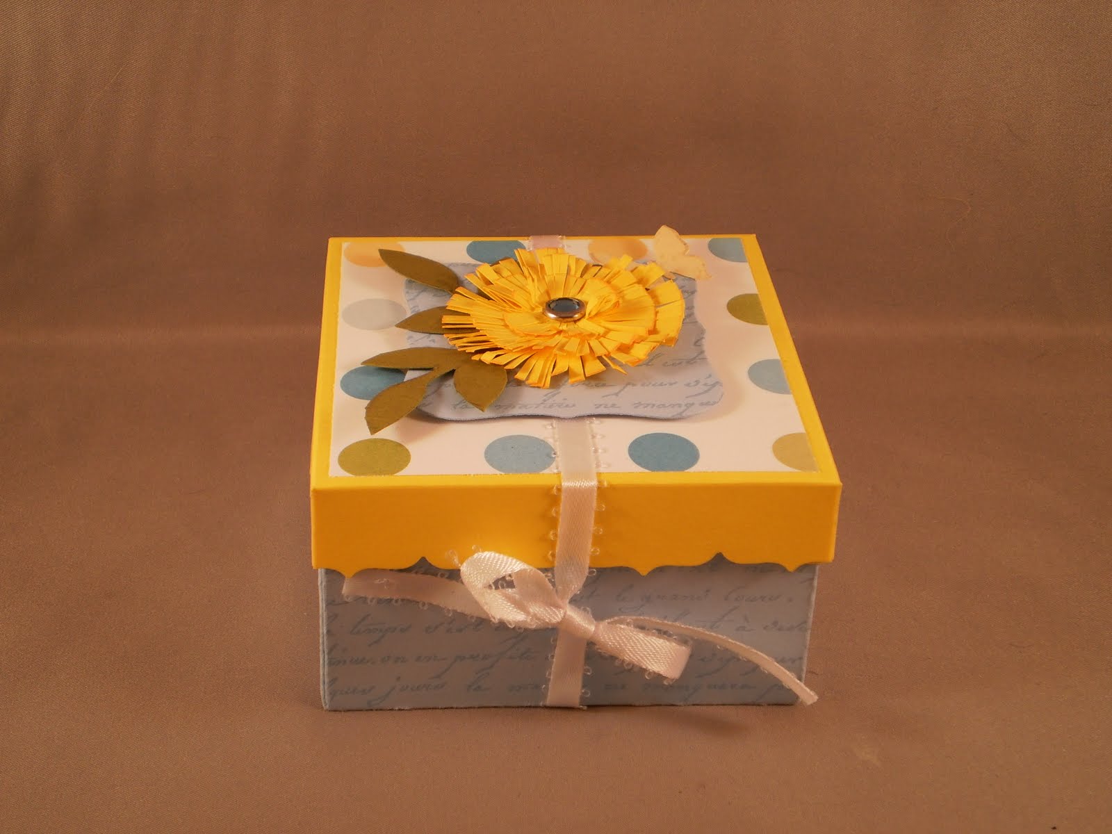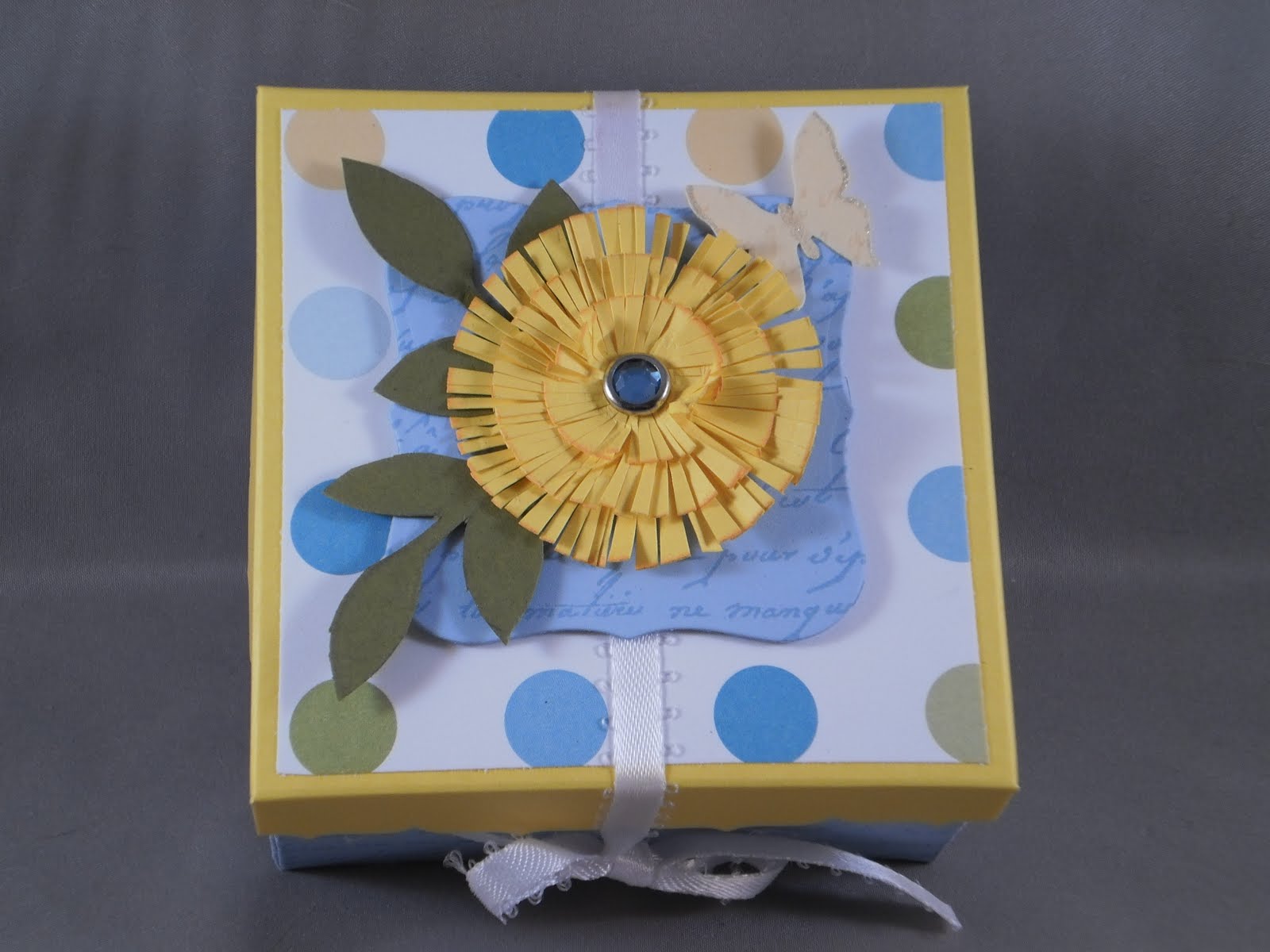 Spring has finally arrived here in the Northeast! This week's JUGS challenge was to create something 3-D with a spin: it had to reflect spring. I created a 3x3 box to hold notecards (maybe). I used this tutorial by Laurie Schmidlin, or at least I tried, but had to change it a bit due to the fact my top paper didn't FIT! Measuring is not my thing, so I just trimmed it down and used it as a layer. The blue and green cs are from PTI, the dotted paper is DCWV and the jeweled brad is from SU! I used a labels one die, and three of the standard circles large dies to create the flower. I drew the leaves and cut them out by hand.