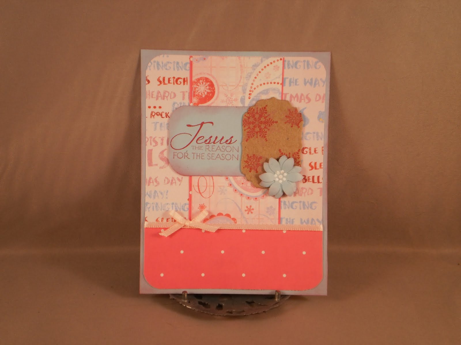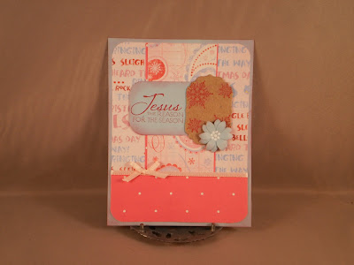 This card is based on the Our Daily Bread Designs sketch challenge. Another Christmas card down. : ) The papers are all DCWV. For the focal point, I used labels one (embossed with a snowflake cuttlebug embossing folder), scalloped ovals large and classic ovals large from spellbinders. "Hope" is from Richly Blessed by Verve and is overstamped with two small snowflakes from an Inkadinkado Christmas set.
