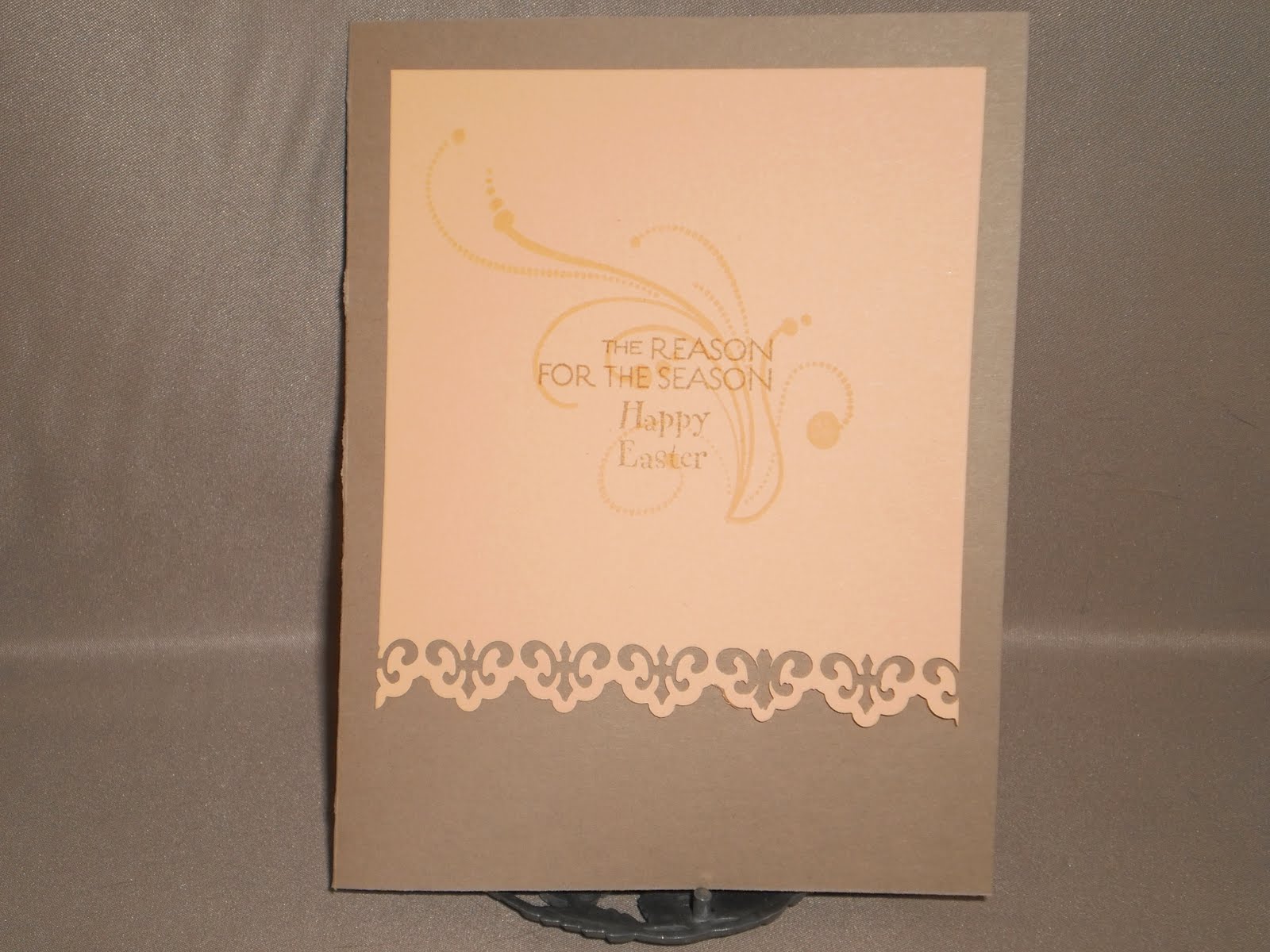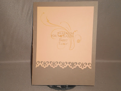 My second card for today uses both the Pretty Palettes 04 (ivory, peach, seafoam, kraft) and the Pretty Patterns 05 challenges by My Time Made Easy. I am also using the Off The Wall Craftiness challenge to make an Easter card using bright colors. I don't have any Easter stamps, so I used the set Richly Blessed by Verve which is designed to be a Christmas set. But as Jesus and the Cross are the real reason to celebrate Easter, I figured it was a good substitute. It looks reather bluish in this picture, but I promise the green really is seafoam. I used the Mat Stack 2 die from Papertrey Ink and a scalloped circle by spellbinders, a fiskars border punch and a flourish stamp by Inkadinkado.