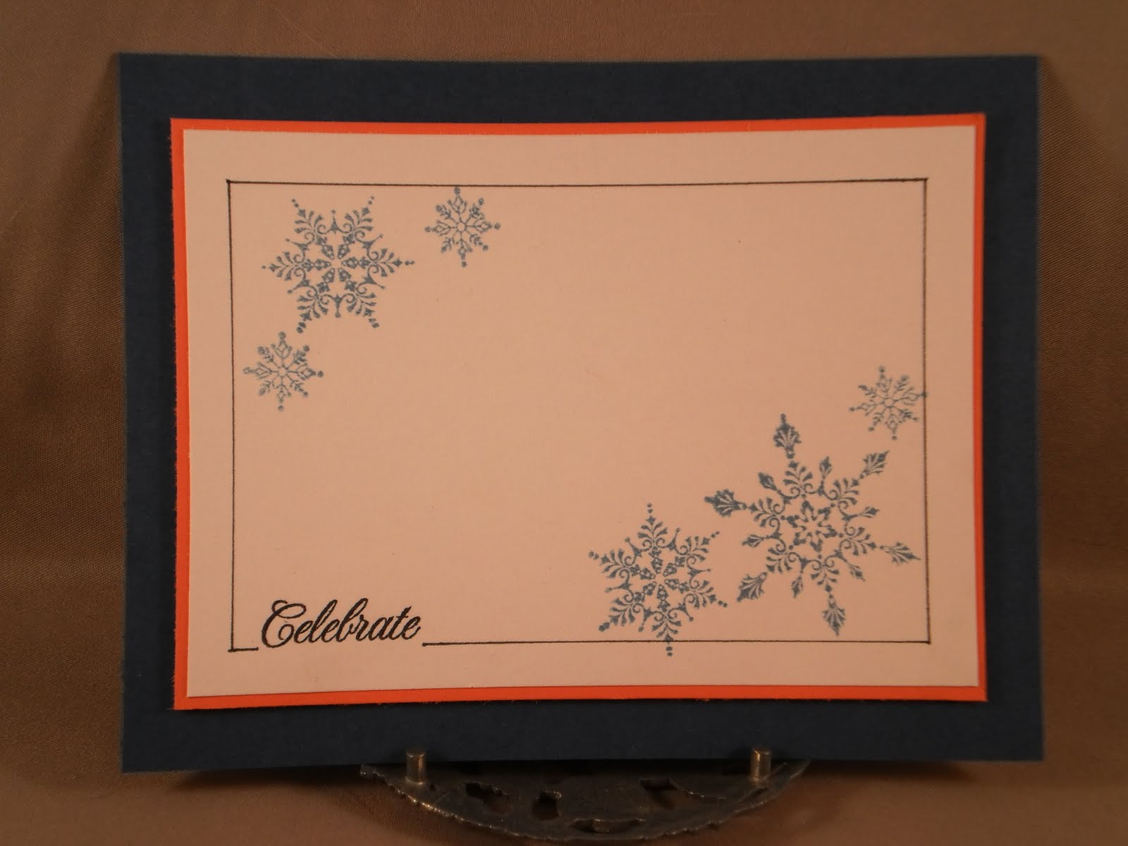 Can you make a Christmas card with the colors white, blue, coral, and navy? Yes, you can! I wasn't sure at first, but I like the results. Those are the colors for the Pretty Palette #6 challenge. I combined that with the Make it Monday challenge from Papertrey Ink to draw a line frame around your image. I used enchanted evening and melon berry cs from PTI and brocade blue ink from SU!. The sentiment is from Damask Designs by PTI and the snowflakes are from Inkadinkado. I don't like to measure and erase like Nicole does in her video, so I use a clear ruler and just eyeball it.
