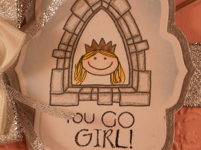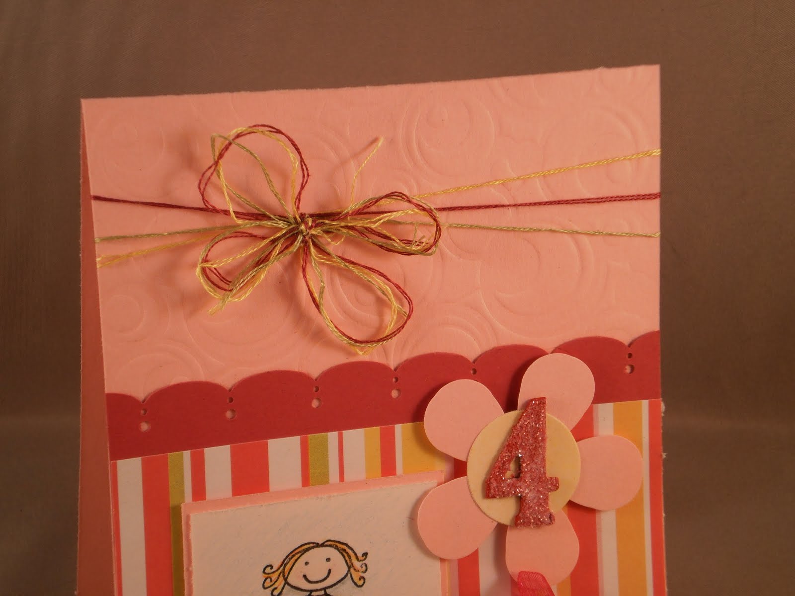 My final card for today is for a sweet little friend of my daughter's who just turned four last week. I used the mojo monday sketch and the Clearly Inspired Challenge #26 sponsored by Clear Dollar Stamps which is to use bling of some sort. Mine is the glittered chipboard number 4. The stamp is from All in the Family by SU! and I colored it to look like the little sweetie (a pretty strawberry blonde). She definitely is a girly-girl so I used lots of pink and the glitter. I used a marvy flower punch, Martha Stewart border punch and my new spellbinders circle impressibility template which you can see much better in the second picture.