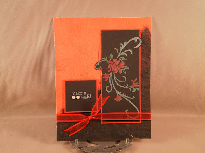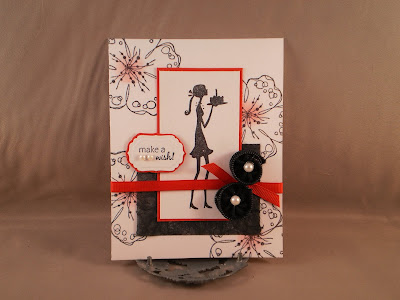 The last card for today combines the Pretty Patterns 02 sketch challenge (from My Time Made Easy) and the Timeless Challenges (Flourishes) challenge to use stamps you haven't used from a set (I like to call them Unloved stamps). This flower is from a whole set of flower flourishes from Inkadinkado. I have used three of the stamps many times, but this one had yet to be "loved" It seemed to be just too big for a focal image. But this sketch with its extra long matted section seemed to fit perfectly. I use the "blackboard" technique: stamping with white on black and coloring the image with colored pencils. It is the first time I tried it and it is really dramatic! I think I love it. : ) The "make a wish" stamp is from "She's All That" by SU! as is the red paper the black is matted on. The background paper looks a bit orange in the picture, but it is definitely red.
