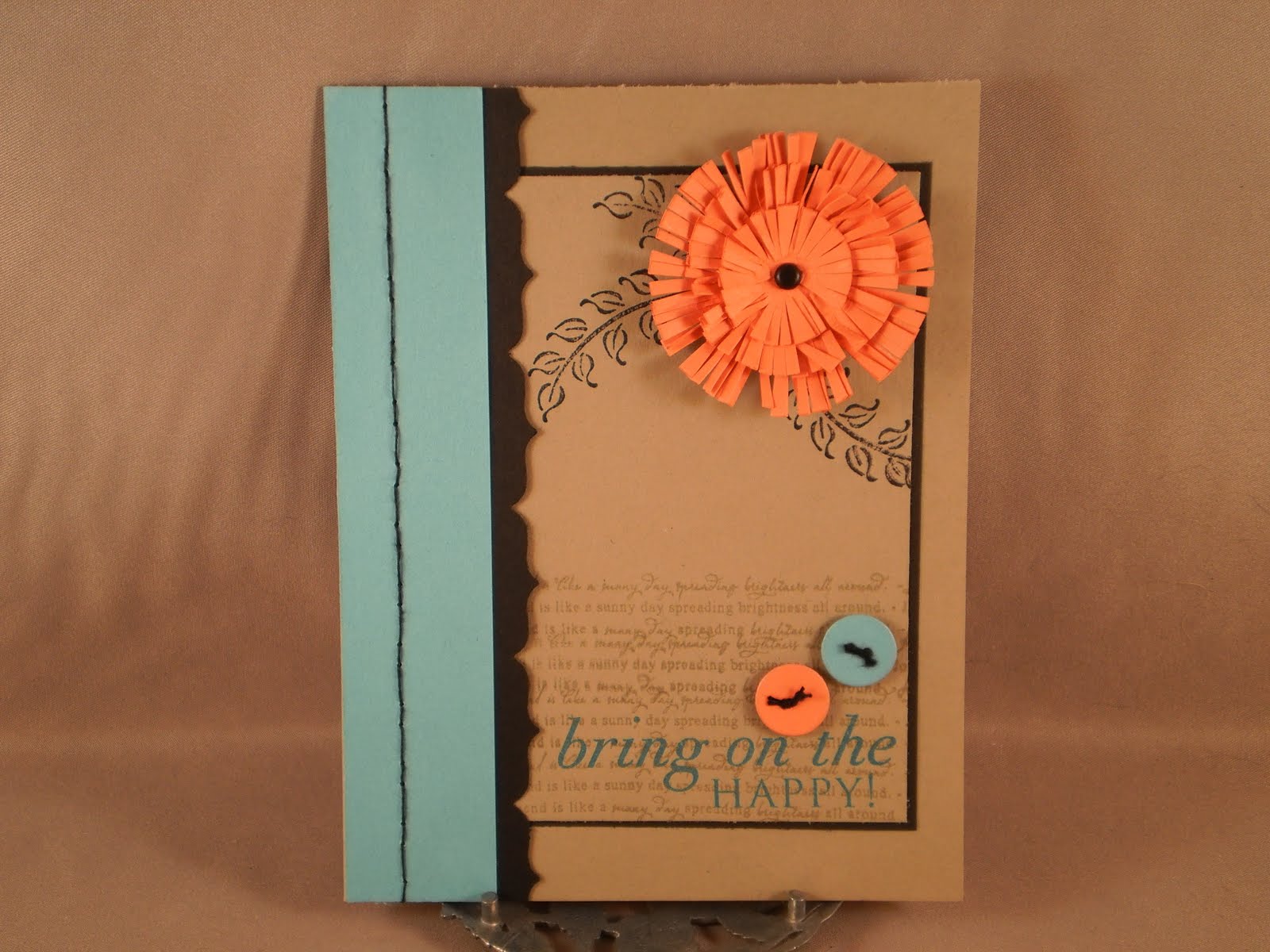 The JUGS challenge for this week: kraft/black/aqua/coral and make a birthday card. This color combo was sooooo hard for me! Not ones I would put together, but I am happy with how the card came out. I am also entering the card in the Our Daily Bread Designs blog challenge to use NO coloring. And the sketch is the Viva La Verve April week 3 sketch. I made the flower out of three circles cut using spellbinders classis circles large dies then fringed the edges, crumpled them up a bit and layered them together with a black brad. Leaf stamps are from an OLD SU! set, sentiment is from a new birthday set from PTI that I can't remember the name of. I made the buttons using on of the PTI button dies. I may never buy buttons again!