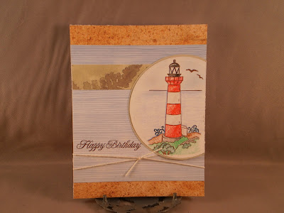 A few posts ago, I used a lighthouse stamp for a birthday card and today I have used a different lighthouse from the same set from Clear Dollar Stamps. My father's birthday is Friday, which reminds me that I have to get this in the mail today (it may already be too late), and it is sooooo hard to make masculine cards since I mostly have floral stamps. But since his favorite color is brown, I decided to go with that and tried to create a vintage card. It made the coloring easy since I only added a little hint of brown to the image. The sketch is this week's mojo monday sketch #185 and I combined that with the make it monday challenge to use heat embossing. Sometimes I get over my head trying to combine challenges before I really think it through and I was at a loss for the heat embossing until I discovered that a stamp from PTI's simply stationery set sort of looked like a compass. So I stamped that on the top background panel and heat embossed it and then added little "N", "E", "W", and "S" with a watermark pen. I also heat embossed "Father" which is from Verve (can't remember which set).