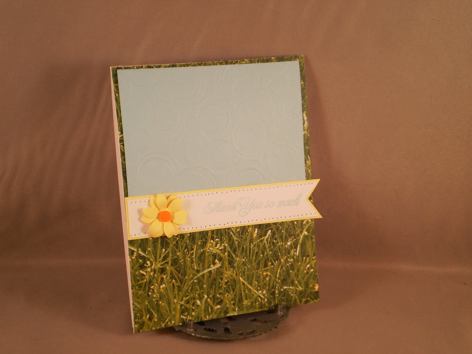 As soon as I saw that one of the colors for the Spring Has sprung challenge was grass green, I knew I had to use this grass paper from DCWV. I was convinced this would never fit on a card, guess I was wrong. The circle embossing on the blue layer did not photograph well, but you can see it better in the second photo. The sentiment is from Damask Designs by PTI (anyone that reads this blog very often will see that is one of my most used sets). And I just "had" to make a daffodil for my flower.